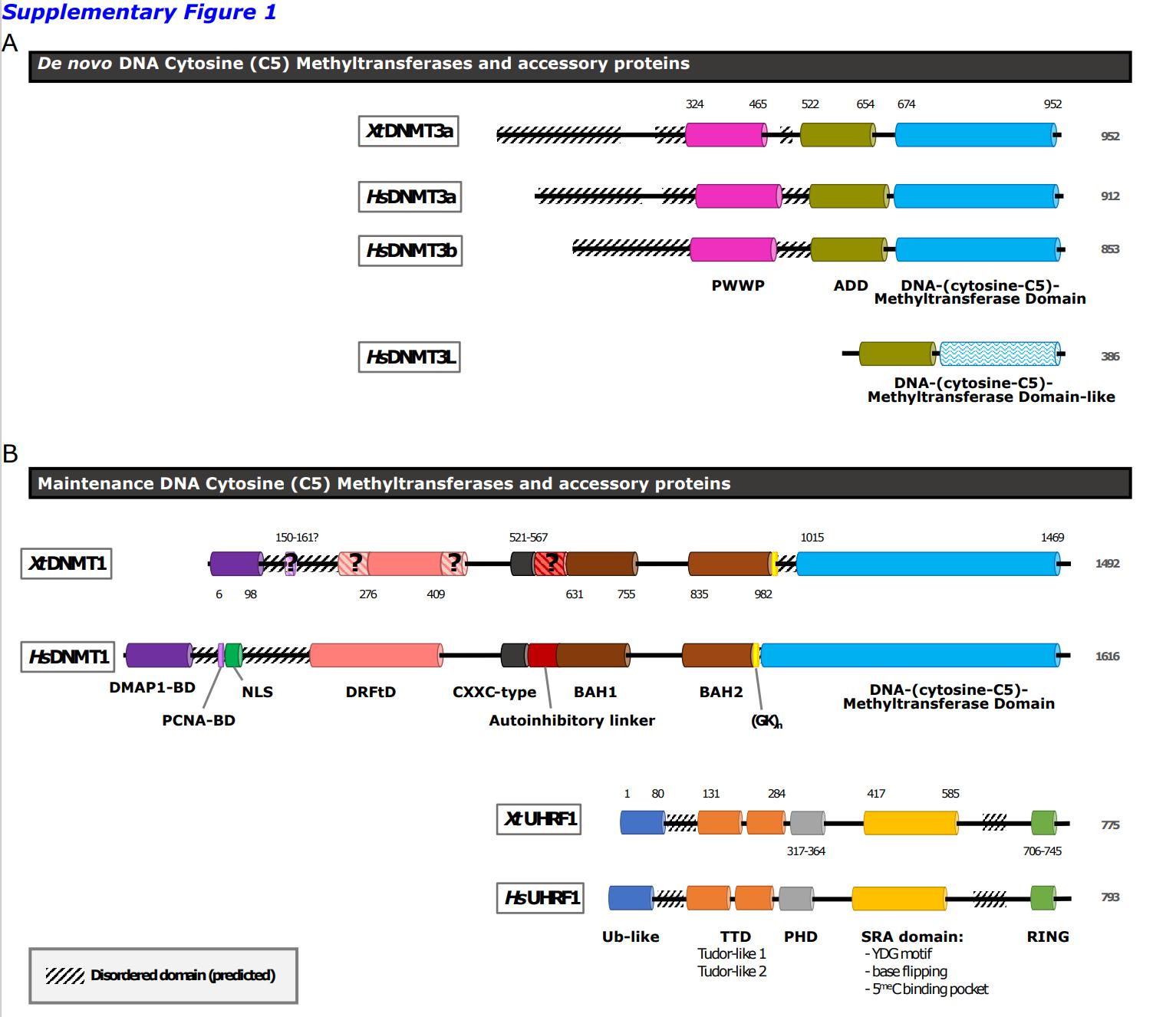 Supplementary Figure 1: Comparison of DNA methyltransferases and main accessory proteins from H. sapiens (Hs) and X. tropicalis (Xt). (A) De novo DNA methyltransferases: XtDNMT3a (accession number F7BU15), HsDNMT3a (Q9Y6K1), HsDNMT3b (Q9UBC3), and HsDNMT3L (Q9UJW3). PWWP domain: Pro-TrpTrp-Pro motif (fuchsia) ; ADD domain: ATRX-DNMT3-DNMT3L, comprised of an N-terminal C2C2-type zinc finger (GATA-like), an imperfect PHD-type C4C4 zinc finger PHD finger and a C-terminal α-helix (olive). DNA-(cytosine-C5)-Methyltransferase Domain: catalytic domain (light blue). DNA-(cytosine-C5)-Methyltransferase Domain – like: inactive methyltransferase domain in DNMT3L (white with light blue zig-zags).(B) Maintenance DNA methyltransferases: XtDNMT1 (F6QE78); HsDNMT1 (P26358); XtUHRF1 (F6UA42); HsUHRF1 (Q96T88). DMAP1-BD: interaction module that binds the