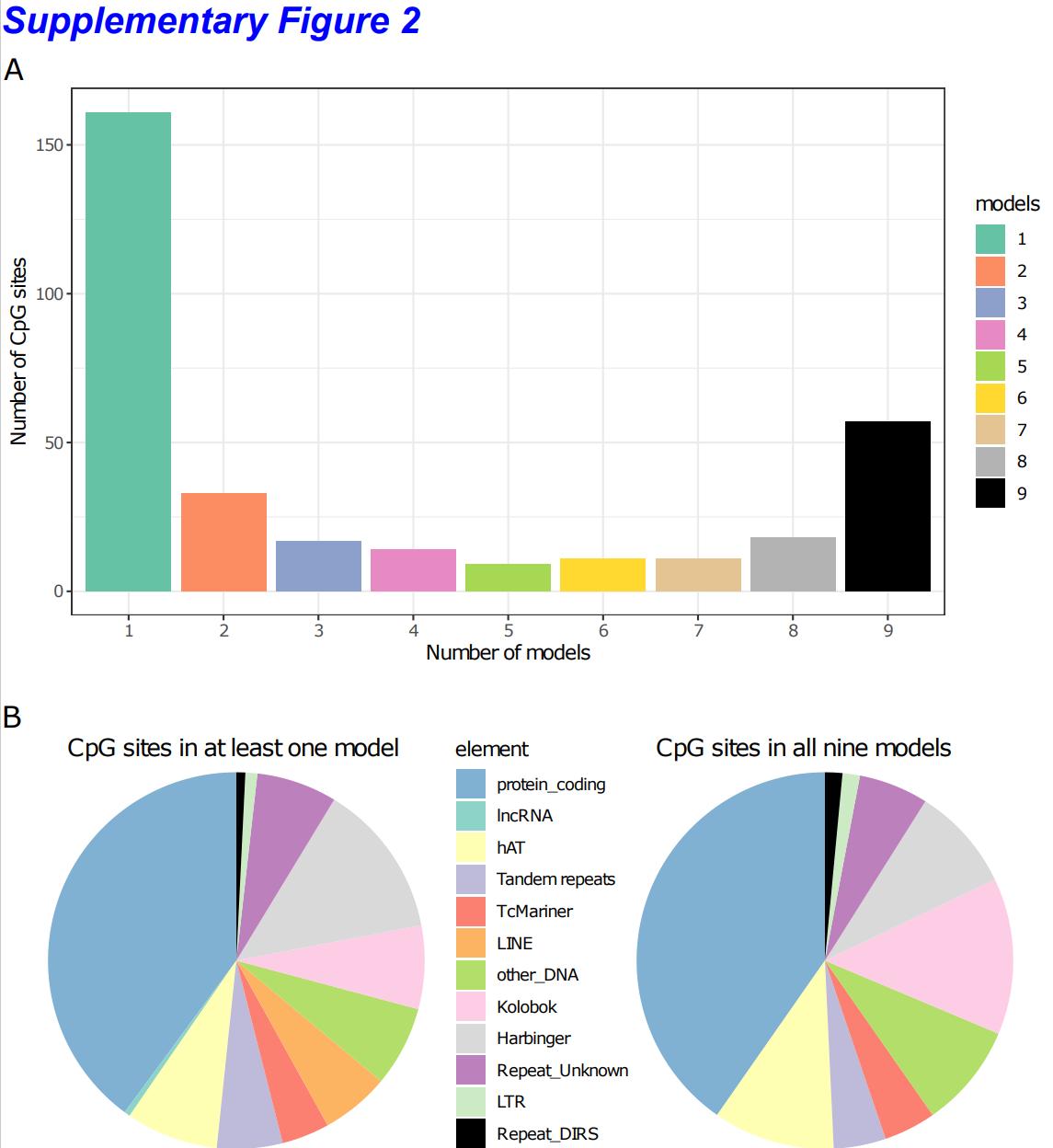 Supplementary Figure 2: Predictive CpG sites. (A) Number of CpG sites used in N models. E.g. The CpG sites in the category “Number of models = 9” correspond to the sites employed by all 9 models; the CpG sites in the category “Number of models = 5” correspond to the sites employed in 5 models only (9 models total). (B) Distribution of the closest genomic elements for all CpG sites used in at least one model (left, corresponding to all the 331 CpG sites) and for the CpG sites common to all 9 models (right, corresponding to the black bar in Supplementary Figure 2A, for a total of 57 CpG sites). Refer to Supplementary Table 2 for the
