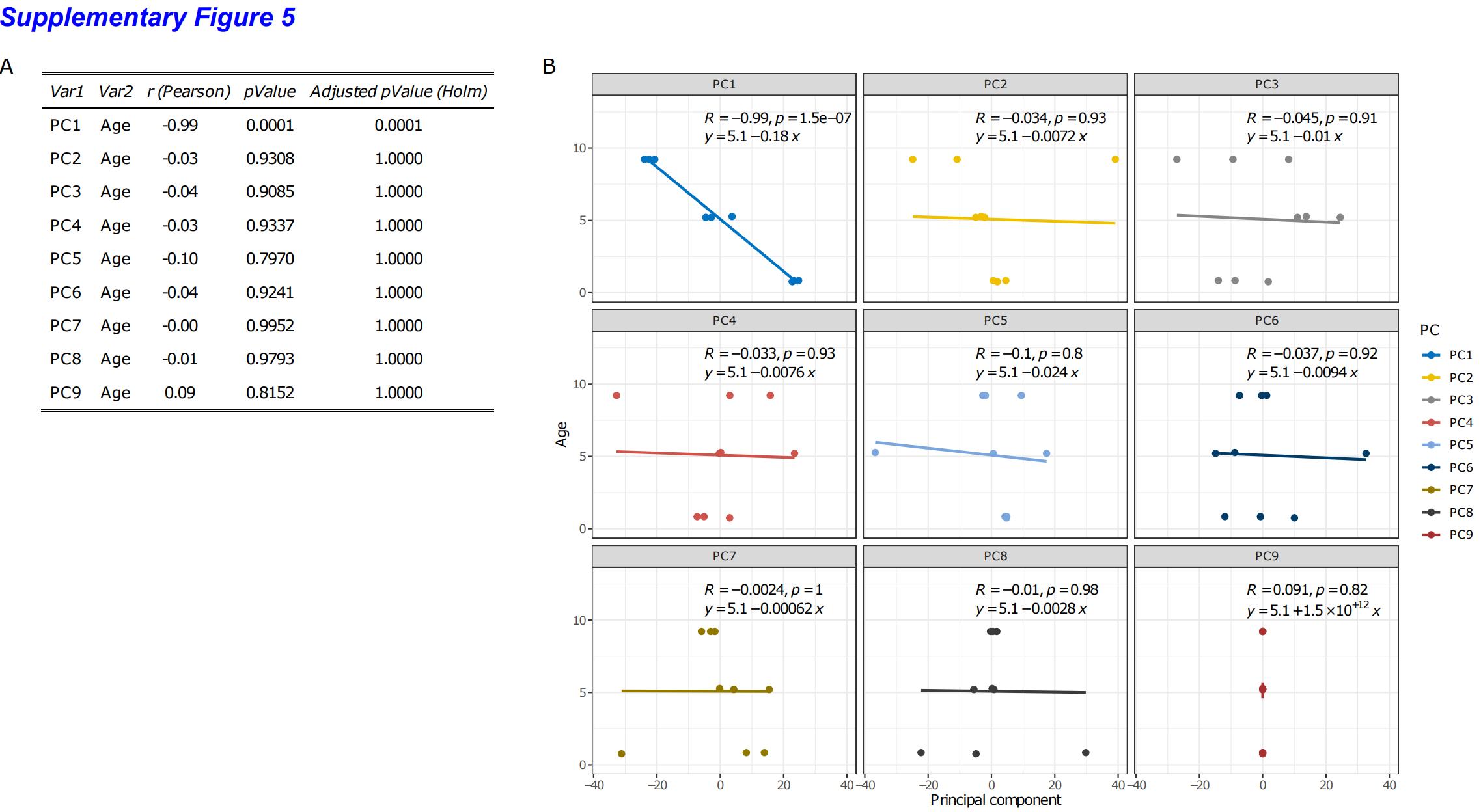 Supplementary Figure 5: (A) Correlation (Pearson) between samples’ age and Principal Components (PC), p-value and adjusted p-value (Holm method). (B) Scatterplots between PCs