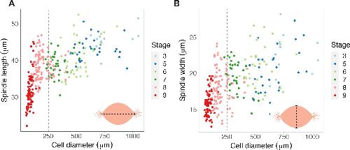 Figure 1—figure supplement 2 Scaling of spindle length vs. width to cell size. (A) Spindle lengths and (B) widths plotted against cell diameter. Gray dotted lines are placed at ~250 μm to help visualize the inflection point reached in spindle length scaling, but not in spindle width scaling. n = 3 biological replicates. Source data are available in Figure 1—source data 1. |