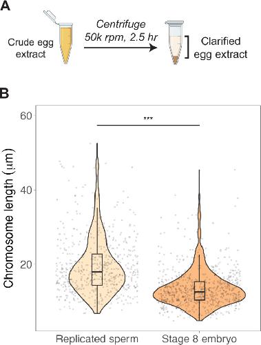 Figure 3—figure supplement 1 Clarified egg extracts support mitotic chromosome scaling. (A) Crude extracts were centrifuged at high speed to pellet membranes. (B) Quantification of mitotic chromosome lengths from either replicated sperm nuclei or stage 8 embryo nuclei added to clarified metaphase egg extracts. n = 3 biological replicates, >50 chromosomes per replicate. ***p<0.001 by the Mann–Whitney U test. Source data are available in Figure 3—source data 1. |