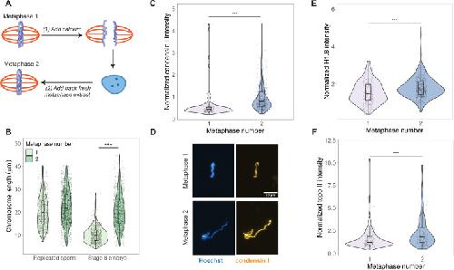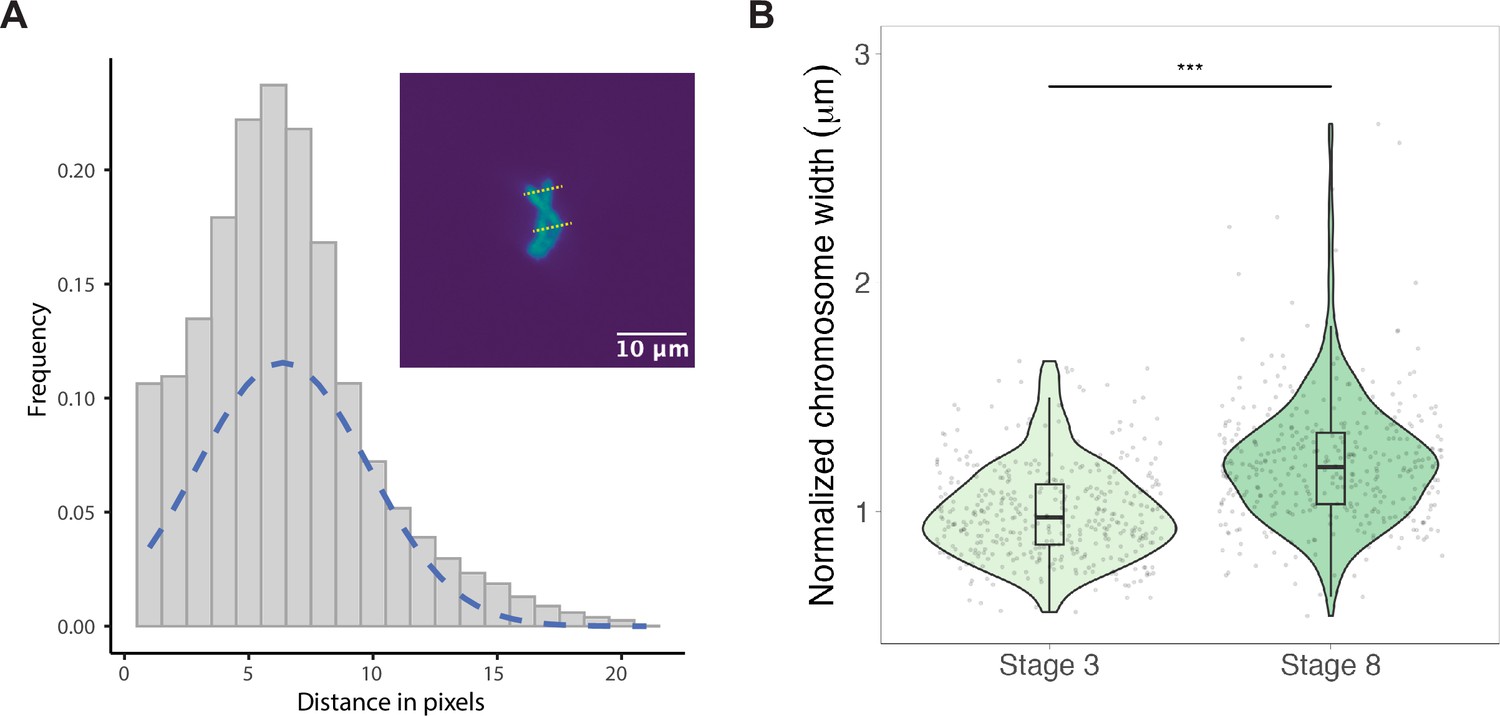 Figure 2—figure supplement 1. Chromosome width increases slightly during early embryo cleavage stages.(A) Chromosome widths were calculated by performing a line scan across the long axis of the chromosome followed by a Gaussian fit. The full width half max (FWHM) of the Gaussian curve was used to determine chromosome width. (B) Chromosome widths of stage 3 vs. stage 8 chromosomes (normalized to the median of stage 3 widths) isolated from mitotic embryo extracts, showing a 1.2-fold increase in median width from stage 3 to stage 8. n = 3 biological replicates. **p<0.001 by the Mann–Whitney U test. Source data are available as Figure 2—source data 1. |