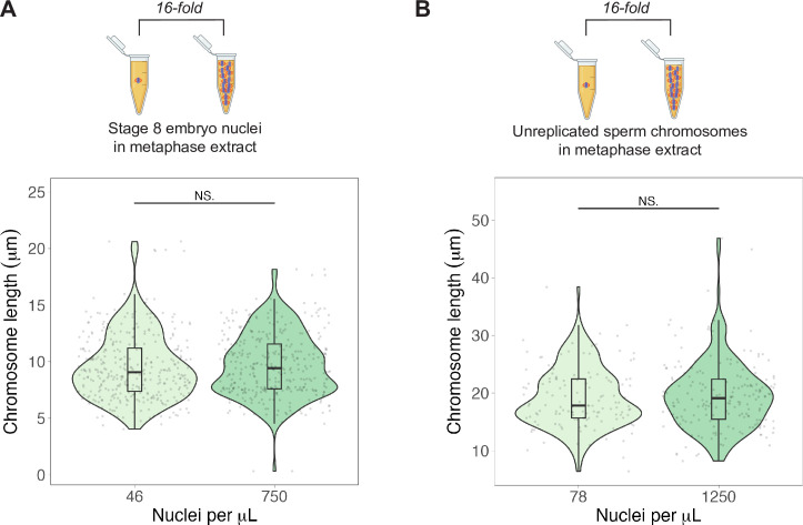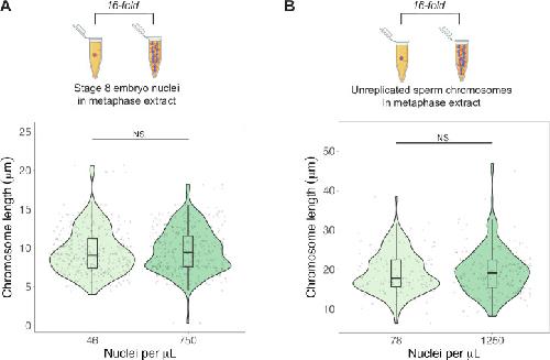 Figure 5—figure supplement 3 Nuclear-cytoplasmic (N/C) ratio does not affect chromosome lengths of embryo chromosomes or unreplicated sperm chromosomes. (A) Top: schematic of experiment—stage 8 embryo nuclei were added to metaphase egg extracts at N/C ratios spanning a 16-fold range. Bottom: quantification of mitotic chromosome lengths in samples containing high or low concentrations of stage 8 embryo nuclei. (B) Top: schematic of experiment—unreplicated sperm chromosomes were added to metaphase egg extracts at N/C ratios spanning a 16-fold range. Bottom: quantification of mitotic chromosome lengths in samples containing high or low concentrations of unreplicated sperm nuclei. n = 3 biological replicates, >50 chromosomes per replicate. For both plots, NS denotes p>0.5 by the Mann–Whitney U test. Source data are available in Figure 5—source data 1. |
