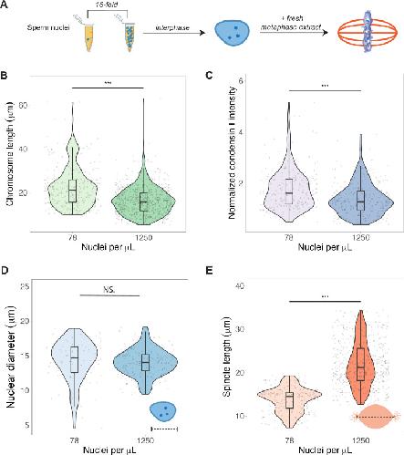 Figure 5. Nuclear-cytoplasmic ratio regulates mitotic chromosome scaling, but not nuclear or spindle scaling.(A) Concentration of sperm nuclei in egg extracts was varied 16-fold to mimic concentrations found in early (78 nuclei/μL) vs. late (1250 nuclei/μL) blastula stages. (B) Quantification of mitotic chromosome lengths and (C) condensin I abundance in extracts containing high or low concentrations of sperm nuclei (difference in median intensity is 1.6-fold). (D) Nuclear diameters for samples containing low or high concentrations of sperm nuclei. (E) Spindle lengths for samples containing low or high concentrations of sperm nuclei. n = 3 biological replicates, >50 structures per replicate, ***p<0.001 by the Mann–Whitney U test. NS denotes p=0.09. Source data are available in Figure 5—source data 1. Figure 5—source data 1. This file contains all of the source data for Figure 5 and related supplemental figures. |