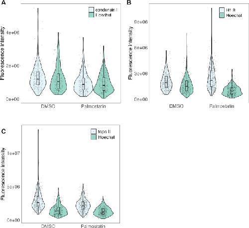 Figure 6—figure supplement 1. Raw fluorescence intensities for palmostatin experiments.Background-subtracted fluorescence intensities for immunofluorescence of (A) condensin I, (B) H1.8 and (C) topo II for data presented in Figure 6D, with protein of interest and Hoechst signals plotted separately. n = 3 biological replicates, >50 chromosomes per replicate. Source data are available in Figure 6—source data 1. |