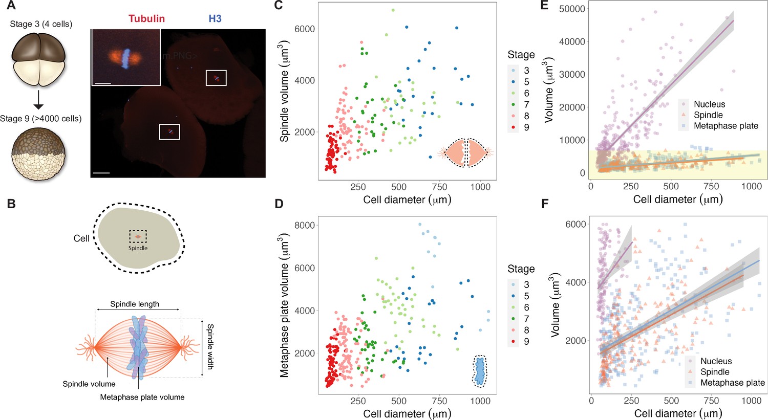 Figure 1. Metaphase plates scale continuously with cell size.(A) Experimental scheme for whole-embryo immunofluorescence. Blastula-stage embryos undergoing synchronous divisions were fixed during mitosis and stained with anti-histone H3 and anti-tubulin antibodies to visualize mitotic chromosomes and spindles, respectively. Representative image of two cells from a stage 6 embryo with white rectangles outlining mitotic spindles, scale bar = 100 μm. Inset: magnified view of one of the mitotic spindles, scale bar = 20 μm. (B) Dimensions of cells and spindles were either directly measured or calculated (for details, see ‘Materials and methods’). (C) Measurements of spindle volume or (D) total mitotic chromosome (metaphase plate) volume plotted against cell diameter, colored by developmental stage. (E) Volumes of spindles, nuclei, and metaphase plates all plotted against cell diameter, fit with linear models. 95% confidence intervals shown in gray. (F) Zoom-in of yellow panel shown in (E). n = 3 biological replicates. Fold-change in size of nuclei (approximately 10-fold), spindles (approximately 2-fold), and metaphase plates (approximately 3-fold) were estimated by calculating the difference in median size in stage 3 vs. stage 8 embryos. Source data are available in Figure 1—source data 1. Figure 1—source data 1. This file contains all of the source data for Figure 1 and related supplemental figures. |
