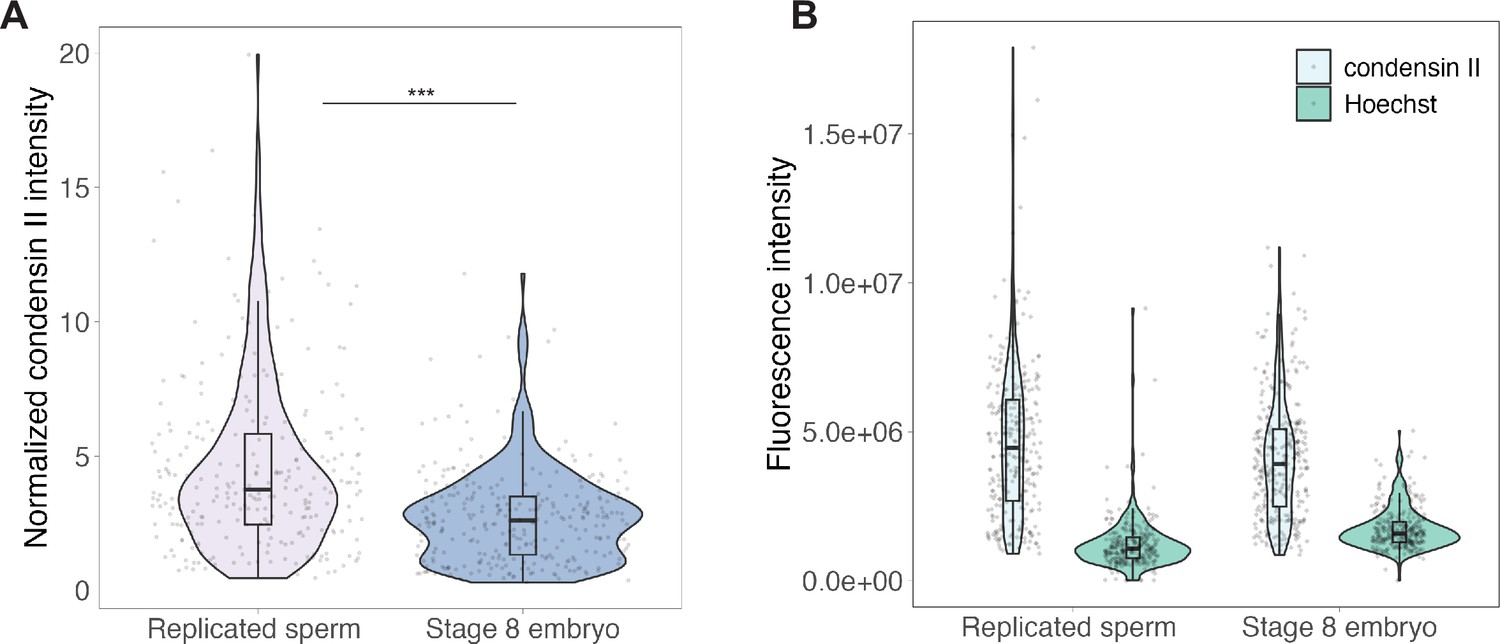 Figure 3—figure supplement 4. Immunofluorescence of condensin II on sperm vs. embryo chromosomes formed in egg extracts.(A) Condensin II intensities of replicated sperm or stage 8 embryo chromosomes, normalized to Hoechst signal. (B) Raw fluorescence intensities for condensin II (xCAP-G2) or Hoechst for the data shown in (A). n = 3 biological replicates, >50 chromosomes per replicate. ***p<0.001 by the Mann–Whitney U test. Source data are available in Figure 3—source data 1. |