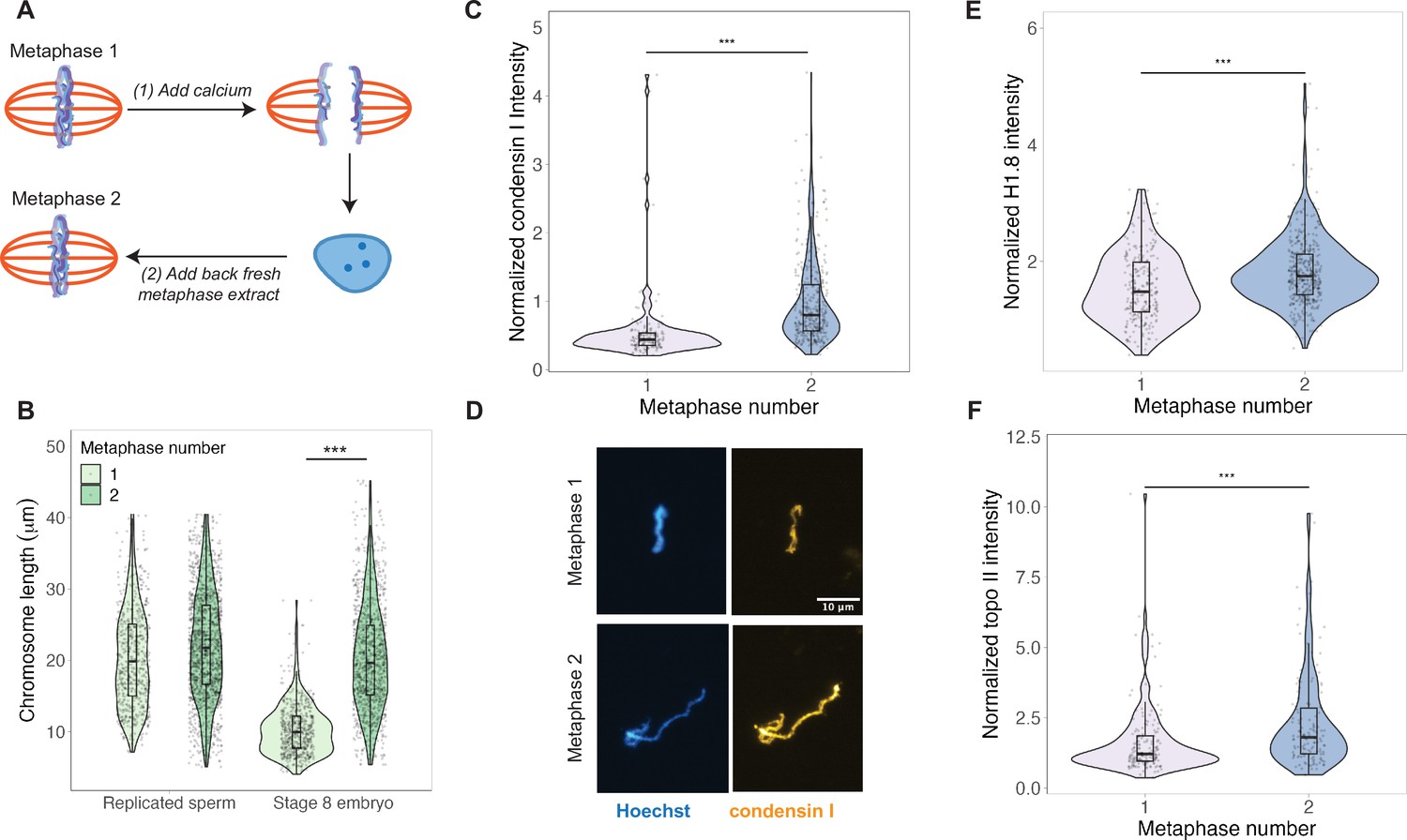 Figure 3—figure supplement 5 Scaling factors are reloaded onto embryo chromosomes after an additional interphase in egg extracts. (A) Schematic of anaphase experiment. Calcium is added to send metaphase spindles containing embryo chromosomes into anaphase, and then interphase. After nuclei were formed, fresh metaphase extract was added to trigger a second round of mitotic chromosome formation. (B) Chromosome lengths for the first and second metaphase, for both replicated sperm and stage 8 embryo mitotic chromosomes. (C) Abundance of condensin I (xCAP-G) on stage 8 embryo chromosomes in the first or second metaphase. (D) Representative images of embryo chromosomes from metaphase 1 or metaphase 2, stained for condensin I. (E, F) Abundance of histone H1.8 and topo II on stage 8 embryo chromosomes in the first or second metaphase. Based on median values, condensin I increased 2-fold, histone H1.8 increased 1.2-fold, and topo II increased 1.5-fold from the first to second metaphase. n = 3 biological replicates, >50 chromosomes per replicate. ***p<0.001 by the Mann–Whitney U test. Source data are available in Figure 3—source data 1. |