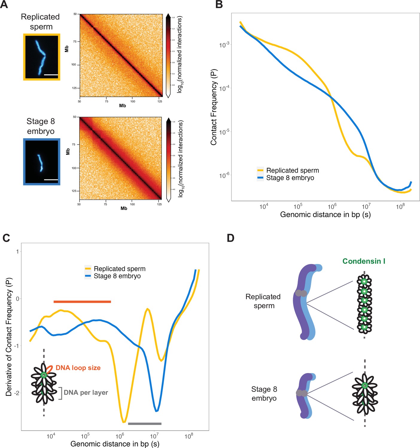 Figure 4 Mitotic chromosomes scale through extensive remodeling of DNA loop architecture. (A) Hi-C maps of chromosome 4S from replicated sperm or stage 8 embryo chromosomes formed in metaphase egg extracts. (B) Plots comparing how contact frequency (P) genome-wide decays as a function of genomic distance (s) for replicated sperm (yellow) or stage 8 mitotic chromosomes (blue). (C) Derivative of contact frequencies from (B). Based on previous models, peaks at 104–106 bp show differences in loop size (orange bar), while inflection points at 106–107 bp reveal differences in DNA amount per layer (gray bar). (D) Model depicting how lower condensin I occupancy on short embryo chromosomes results in an increase in DNA loop size and DNA per layer. Plots display average values from two biological replicates. Source data available as Figure 4—source data 1. |