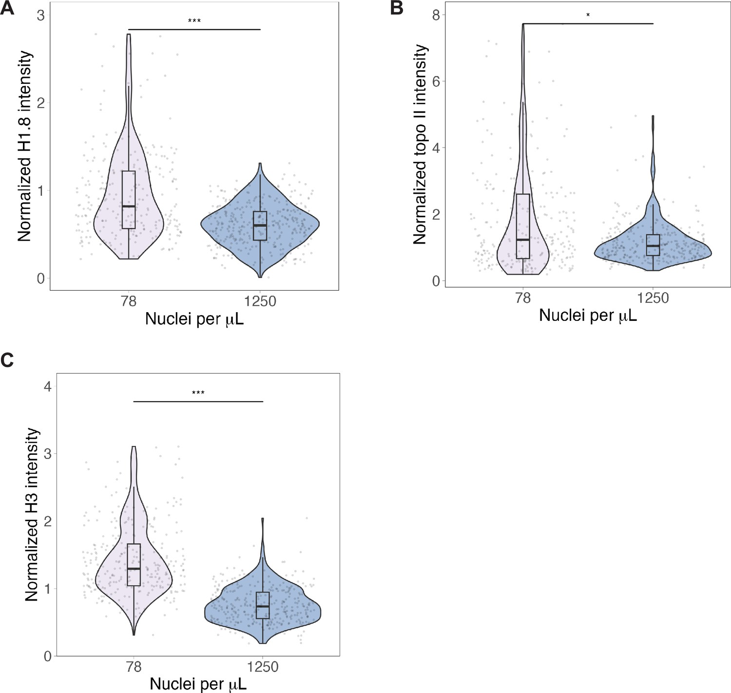 Figure 5—figure supplement 1 Titration of topo II, histone H1.8, and H3 on mitotic chromosomes. Normalized fluorescence intensity of (A) H1.8, (B) topo II, and (C) H3 on sperm mitotic chromosomes in samples containing low or high concentrations of nuclei. Differences in median intensities: 1.4-fold for H1.8, 1.2-fold for topo II, 1.8-fold for H3. n = 3 biological replicates, >50 chromosomes per replicate, ***p<0.001 by the Mann–Whitney U test. *p=0.0013. Source data are available in Figure 5—source data 1. |