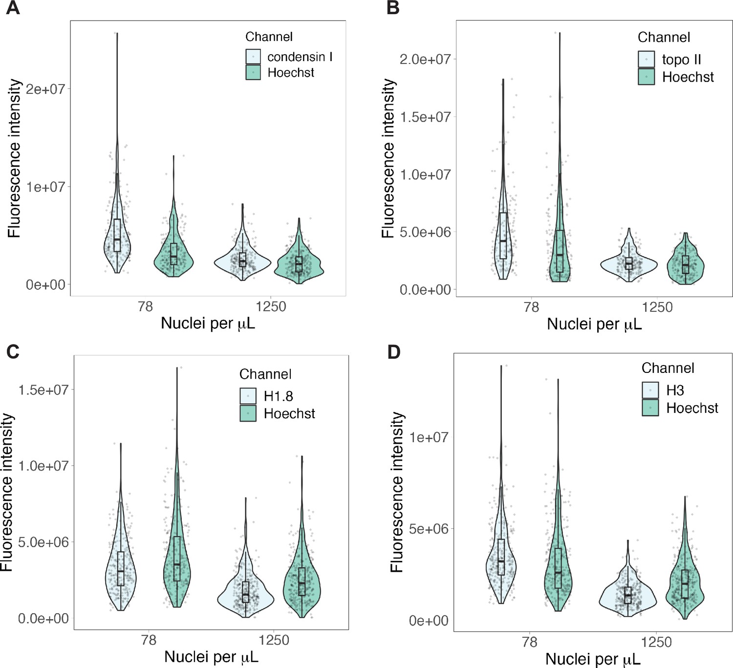Figure 5—figure supplement 2 Raw fluorescence intensities for nuclear-cytoplasmic (N/C) ratio experiments. Background-subtracted fluorescence intensities for immunofluorescence of (A) condensin I, (B) topo II, (C) H1.8 and (D) H3 presented in Figure 5C and Figure 5—figure supplement 1A-C. Channels for protein of interest and Hoechst plotted separately. n = 3 biological replicates, >50 chromosomes per replicate. Source data are available in Figure 5—source data 1. |