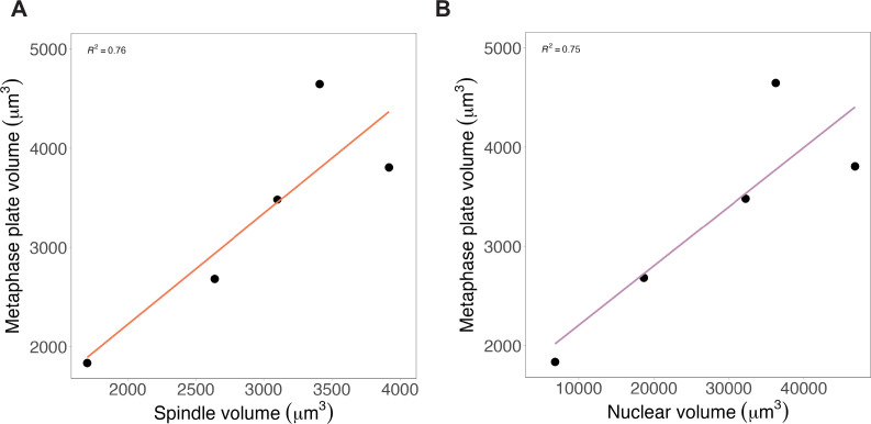 Figure 1—figure supplement 4 Metaphase plates scale similarly with both nuclei and spindles. (A) Average total mitotic chromosome volumes plotted against (A) spindle volumes or (B) nuclear volumes, binned by cell diameter (bin 1 = 35–239 μm, bin 2 = 239–442 μm, bin 3 = 442–645 μm, bin 4 = 645–848 μm, bin 5 = 848–10,500 μm). Data are fit with a linear regression, n = 3 biological replicates. Source data are available in Figure 1—source data 1. |