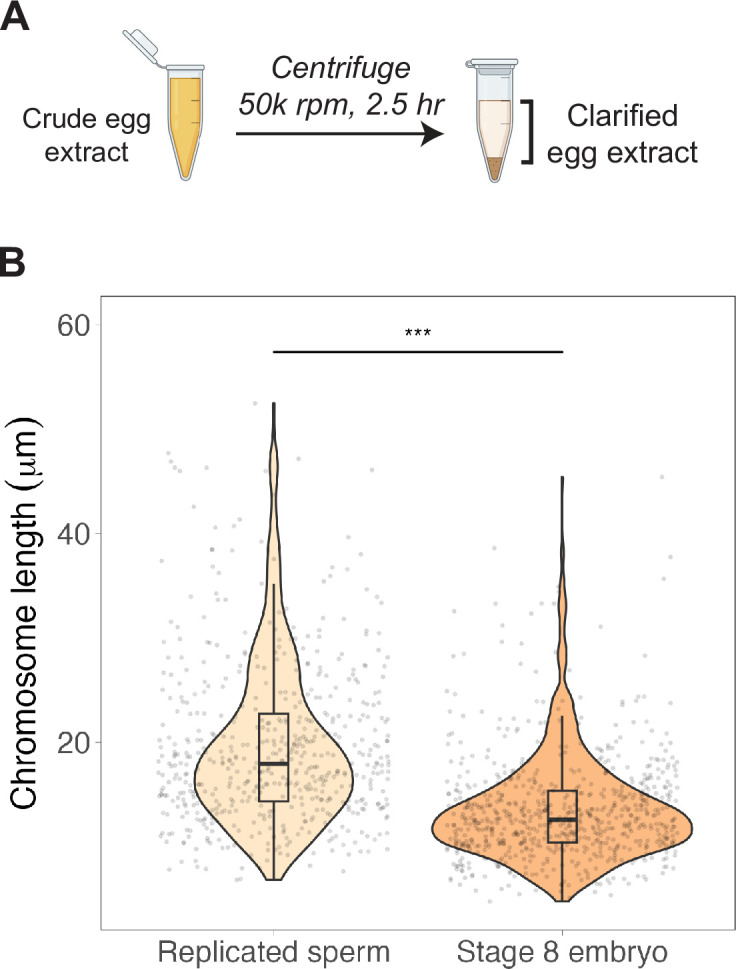 Figure 3—figure supplement 1. Clarified egg extracts support mitotic chromosome scaling.(A) Crude extracts were centrifuged at high speed to pellet membranes. (B) Quantification of mitotic chromosome lengths from either replicated sperm nuclei or stage 8 embryo nuclei added to clarified metaphase egg extracts. n = 3 biological replicates, >50 chromosomes per replicate. ***p<0.001 by the Mann–Whitney U test. Source data are available in Figure 3—source data 1. |