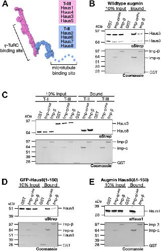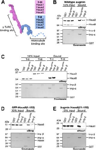 Figure 1. Augmin binds to importins. A, structure of the augmin complex, broken into the γ-TuRC binding T-III (pink), comprised of subunits Haus1 and Haus3–5, and the MT-binding T-II (blue), comprised of subunits Haus2 and Haus6–8. The disordered N terminus of Haus8 (shown as a dashed blue line) contains the primary MT-binding site. Structure of Xenopus augmin was taken from Ref. (39). B, glutathione beads bound to either GST (control), GST-importin-αΔIBB, or GST-importin-β were incubated with full-length augmin, then both the input and bound fraction were Western blotted for intact augmin complexes using an antibody against the Strep-tagged subunits Haus3 (T-III) and Haus8 (T-II). Below, GST and GST-importin loading was demonstrated by Coomassie stain. C, as in (B), importin-bound beads were incubated with augmin, either T-III or T-II, and binding of intact augmin subcomplex was detected via Western blot against the Strep-tagged subunits Haus3 and Haus8. D, Haus81–150 (fused to an N-terminal Strep-tagged GFP) was incubated with importin-bound beads, and binding was detected via Western blot. E, augmin complex lacking the N-terminal 150 residues of Haus8 was incubated with importin-bound beads, and binding of intact augmin complex was detected via Western blot against augmin subunit Haus1. γ-TuRC, γ-tubulin ring complex; GST, glutathione-S-transferase; IBB, importin-β binding; MT, microtubule; T-III, tetramer III. |