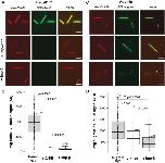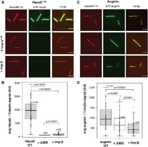 Figure 3. Importins regulate augmin binding to MTs.A, WT GST-GFP-Haus8 localizes strongly to GMPCPP-stabilized MT seeds in vitro (top row), as visualized by TIRF microscopy. In the presence of importin-αΔIBB (middle row) or importin-β (bottom row), binding of Haus8 to MTs is diminished. This is quantified in B. B, boxplot of average GFP-Haus8 signal relative to the average tubulin signal, where each marker represents a single MT from the experiment shown in F. The total number of MTs (n) was collected from two replicates. The boxes extend from the 25th to 75th percentile, and the upper and lower bars represent the minimum and maximum, respectively. p Values were calculated from independent t tests. C, WT GFP-labeled augmin localized to GMPCPP-stabilized MT seeds in vitro (top row), as visualized by TIRF microscopy. In the presence of importin-αΔIBB (middle row) or importin-β (bottom row), binding of augmin to MTs is decreased but not eliminated. This is quantified in D. D, boxplot of average GFP-augmin signal relative to the average tubulin signal, where each marker represents a single MT from the experiment shown in F. The total number of MTs (n) was collected from two replicates using two independent augmin preparations. Center lines show the medians; box limits indicate the 25th and 75th percentiles as determined by R software; whiskers extend 1.5 times the interquartile range from the 25th and 75th percentiles. p Values were calculated from independent t tests. In A and C, images belonging to the same experiment were contrast matched. To compare Haus8 fluorescence intensity across experiments, the intensity was normalized with respect to the tubulin signal. Scale bars correspond to 5 μm. GST, glutathione-S-transferase; IBB, importin-β binding; MT, microtubule; TIRF, total internal reflection fluorescence. |