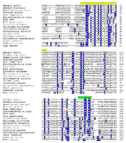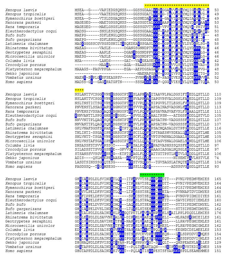 Supplemental Figure 1: Sequence alignment of the N-terminus of Haus8. Selected species include frogs (Xenopus, Hymenochirus, Nanorana, Rana, and Eleutherodactylus), toads (Bufo), other amphibians (Latimeria, Rhinatrema, Geotrypetes, and Microcaecilia), as well as reptiles (Columba, Crocodylus, Platysternon, and Gekko) and mammals (Vombatus and Homo sapiens). Basic lysine and arginine residues are highlighted in blue. Note that, due to incomplete genome annotation, the first exon of Gekko japonicus is missing. NLS1 is indicated with yellow asterisks and NLS2 with green asterisks. |
