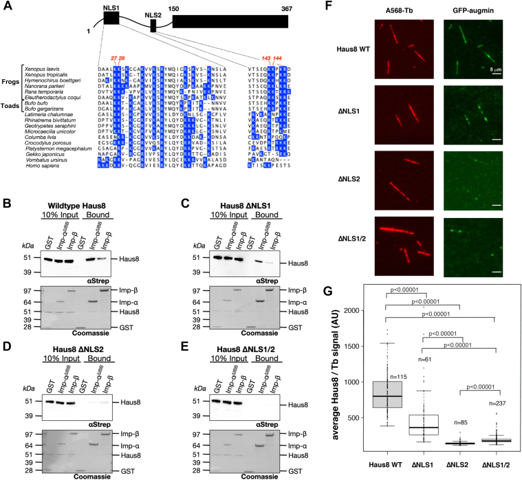 Figure 2. Haus8 of augmin binds to importins and MTs through two NLS sites. A, the augmin subunit Haus8 is predicted to contain two NLS sequences within its disordered N terminus (43). The domain architecture of Haus8 is cartooned at top, and the sequence of each predicted NLS in Xenopus laevis is shown at the bottom. X. laevis Haus8 is shown aligned to other vertebrate orthologs below, and all basic residues (arginine abbreviated as R and lysine as K) are highlighted in blue. Indicated in red at the top of the sequence are the pairs of basic residues mutated to alanine to generate the Haus8 mutants ΔNLS1 (K27A/K28A) and ΔNLS2 (K143A/K144A). B–E, pulldowns of Strep-GFP-Haus81–150, either wildtype or containing the indicated NLS mutants, were conducted as for Figure 1D. F, selected TIRF images of in vitro binding of GST-GFP-Haus81–150 to stabilized MT seeds. Haus8 constructs with mutated residues in NLS1 and/or NLS2 result in a reduction in binding, as quantified in G. Images belonging to the same experiment were contrast matched. To compare augmin fluorescence intensity across experiments, the intensity was normalized with respect to the tubulin signal. G, boxplot of average GFP-Haus8 signal relative to the average tubulin signal, where each marker represents a single MT from the experiment shown in F. The total number of MTs (n) was collected from two replicates. Center lines show the medians; box limits indicate the 25th and 75th percentiles as determined by R software; whiskers extend 1.5 times the interquartile range from the 25th and 75th percentiles. p Values were calculated from independent t tests. GST, glutathione-S-transferase; MT, microtubule; NLS, nuclear localization signal; TIRF, total internal reflection fluorescence. |