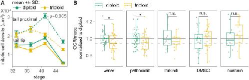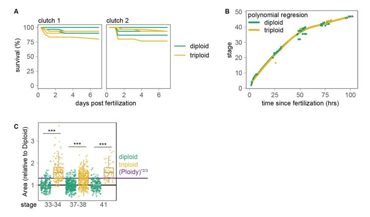 Figure S1. Triploid embryos develop and survive at rates comparable to diploids. Related to Figure 1. (A)Survival rate over the first 7 days post fertilization for two representative clutches. Each line represents a technical replicate. (B) Developmental curves of diploids and triploids at 24oC (three clutches containing diploids and triploids). The line represents a polynomial fit. (C) Area of diploid and triploid goblet-like cells in embryos at stages 33-34, 37-38 and 41, normalized to diploids of each clutch. (3 clutches, n>68 for each condition). Welch two sample t-test comparing the means, *: p<0.5, **: p<0.01,***: p<0.001. |