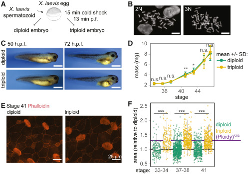Figure 1. Triploid X. laevis develop normally (A) Triploid X. laevis were obtained by blocking polar body extrusion post fertilization (pf) using a cold shock. (B) The 1.5-fold increase in chromosome number in triploid (3N) compared with diploid (2N) embryos was verified by metaphase chromosome spreads. Scale bars, 10 μm. (C) Representative images of diploid and triploid embryos obtained from the same clutch of eggs. Scale bars, 1 mm. (D) Compared with diploids, triploids showed a comparable mass increase except for a transient ∼5% reduction during day 3 (19 clutches, n = 10–82 embryos per ploidy and stage; details in Table S1). (E) TMR-phalloidin staining of actin in ventral epithelial cells of stage 41 diploid and triploid X. laevis embryos showing cell outlines and strong actin enrichment at the surface of multiciliated cells. (F) Area of diploid and triploid multiciliated cells in embryos at stages 33–34, 37–38, and 41, normalized to diploids of each clutch. (3 clutches, n > 150 for each condition). (D and F) Welch two-sample t test comparing the means, ∗p < 0.5, ∗∗p < 0.01, ∗∗∗p < 0.001. See also Figure S1. |