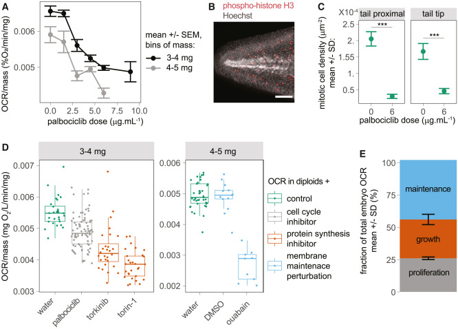 Figure 3. An embryo energy budget establishes the costs of proliferation, biosynthesis, and maintenance (A) OCR per mass as a function of palbociclib doses for stage 41 diploid embryos and two bins of mass (6 clutches, n = 2–57 per bin of mass and palbociclib concentration). (B) Representative image of phospho-histone H3 immunostaining and Hoescht DNA dye staining of tadpole tails (scale bar, 200 μm). (C) Mitotic cell density in the tails of stage 41 diploid embryos assessed by quantifying phospho-histone H3-positive cells (n = 2, 5–6 embryos per clutch, Welch two-sample t test comparing the means, ∗∗∗p < 0.001). (D) OCR per mass for stage 41 diploid embryos in water, 6 μg/mL palbociclib, 12.5 nmol/mL torkinib, 1 μg/mL torin-1, 0.1% DMSO, or 200 μg/mL ouabain. (E) The percentage decrease of OCR in diploids upon treatment with drugs in (D) provides an estimate of the contribution of proliferation (palbociclib), growth (torkinib, torin-1), and maintenance (ouabain) to the overall embryo energy expenditure. See also Figures S3 and S4. |
