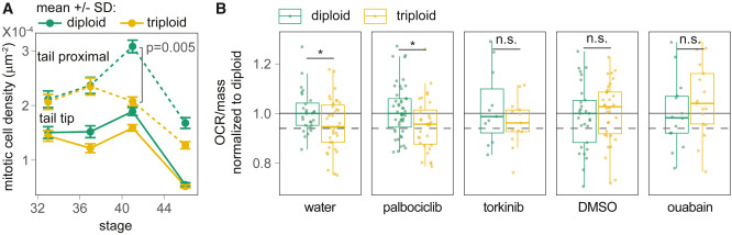 Figure 4. The energetic cost of cell membrane maintenance, not proliferation, accounts for the difference in metabolism between diploids and triploids (A) Mitotic cell density in the tails of diploid and triploid embryos assessed by quantifying phospho-histone H3-positive cells (n = 3, 5–6 embryos per clutch). (B) OCR per mass normalized to the median diploid value for each condition in stage 41 tadpoles during a 6-h incubation in water, 6 μg/mL palbociclib, 12.5 nmol/mL torkinib, 0.1% DMSO, or 200 μg/mL ouabain. Results are shown for 3–4 mg embryos except 5–6 mg for ouabain (n = 3–5 clutches per condition; details in Table S4). Dashed line indicates the average in untreated triploids. Welch two-sample t test comparing the means, ∗p < 0.5, ∗∗p < 0.01, ∗∗∗p < 0.001. See also Figure S4. |