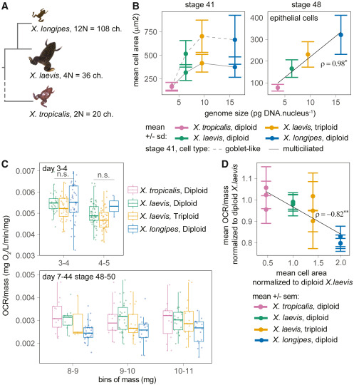 Figure 5. Metabolic rates of Xenopus species scale with cell size, not ploidy (A) X. longipes, X. laevis, and X. tropicalis are 12N, 4N, and 2N, respectively, with corresponding differences in chromosome (ch.) number; tree not to scale with phylogenetic distances. (B) Cell size measurements show scaling with genome size at stage 48, but not stage 41 (2–5 clutches, n > 40 per condition, error bars represent the standard deviation, X. tropicalis and X. longipes stage 48 data from Miller et al.23). (C) OCR across species: (top) before the onset of cell size scaling with genome size at day 3–4 (stage 41–46) and (bottom) after scaling onset (stage 48–50) at day 6–8 (X. laevis), 7–13 (X. longipes), and 26–46 (X. tropicalis) (see Table S5 for n of each bin). (D) OCR data at stages 48 or later (from C, bottom) normalized to the mean X. laevis diploid value for each bin of mass (each dot is the value for a different bin of mass and species) and plotted as a function of mean cell area at stage 48 (B) normalized to the X. laevis diploid value. (B and D) ρ is the Pearson’s correlation coefficient of the means weighted by the SD (∗p < 0.05, ∗∗p < 0.01). See also Figures S2 and S5. |