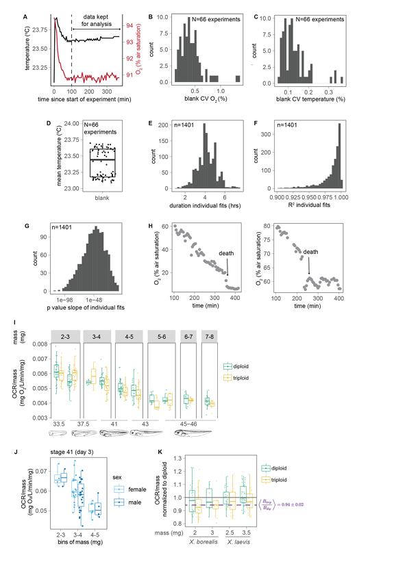 Figure S2. Quality controls and details of OCR experiments. Related to Figures 2 and 5. (A)Example of measurements obtained using a blank vial containing no tadpoles. Blanks were used to assess the time at which O2 and temperature stabilized for each experiment. Timepoints acquired before equilibration were discarded. Details of the coefficient of variation (CV) of O2 (B) and temperature (C) in the blanks of each of the 66 experiments used for Figures 2B-D and 5CD show that these variables were very stable once the timepoints prior to equilibrium were removed. (D) Average temperature showed little variation across all experiments. Details of the duration (E), R2 (F), and p values (G) of all 1401 individual linear fits performed to calculate singleembryo or single-tadpole OCR for all 66 experiments used for Figures 2B-D and 5C-D. (H) Examples of two OCR experiments during which the embryo died showing that there is no subsequent O2 consumption, suggesting a negligible contribution of bacteria to the OCR measurements. (I) Comparison of OCR normalized to mass and binned by mass and stage over 5 days of development reveals a transient increase followed by consistent decrease in metabolic rate in X. laevis triploids compared to diploids (3 to 5 clutches per condition, details in Table S3). (J)OCR and subsequent sex genotype using PCR was performed on diploid X. laevis stage 41. X.laevis triploids are all females due to the way they are obtained. Comparison of OCR in male and female X. laevis diploids reveals no sex-related metabolic differences, indicating that this was not a cause of the OCR decrease in triploids. (K) Normalization to diploid animals indicates that both X. borealis and X. laevis have a ~6% decrease in metabolic rate. |