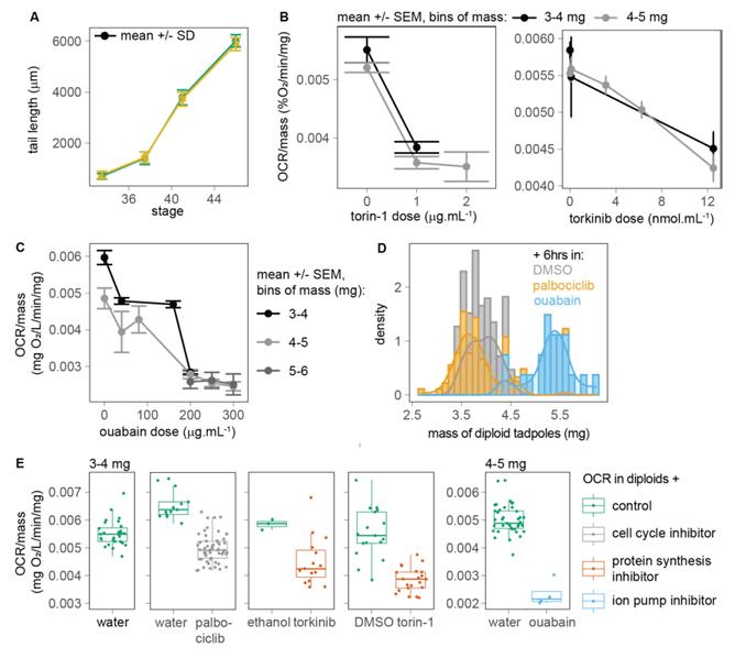 Figure S3. Controls for the drug treatments used to establish the embryo energy budget at stage 41. Related to Figure 3. (A)Tail length throughout development (2-4 clutches per stage, n > 30 embryos per ploidy and stage). (B) OCR per mass as a function of torin-1 (left) and torkinib (right) doses for stage 41 diploid embryos and two bins of mass. Torkinib doses higher than 12.5 nmol/mL induced significant death rate and were thus removed from the analysis (torin-1: 3 clutches, n = 4-22 per bin of mass and dose; torkinib: 2 clutches, n = 2-20 per bin of mass and dose). (C) OCR per mass as a function of ouabain doses for stage 41 diploid embryos and three bins of mass (6 clutches, n = 5-26 tadpoles per bin of mass and dose). (D) The 6-hr treatment with ouabain induced a significant increase in embryo body mass compared with embryos treated with palbociclib or DMSO. This is likely because of perturbations of intracellular osmolarity following inhibition of the Na+/K+ ATPase. (E) Details of results from Figure 3D showing OCR/mass in diploids for each pairof control (drug solvent) and drug treatment. Palbociclib and ouabain were solvated in water, torkinib in ethanol (final ethanol concentration at 0.025%), and torin-1 in DMSO (final DMSO concentration at 0.1%). The solvents did not affect the average OCR/mass value compared with embryos in water. Palbociclib experiments displayed a slightly higher control value (see Figure S4A). |