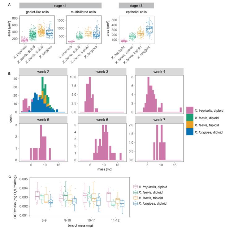 Figure S5. Details of cell size and mass measurements across species. Related to Figure 5. (A)Area of goblet-like and multicilliated cells measured as in Figure 2A-B at stage 41 and at stage 48 (data for X. tropicalis and X. longipes at stage 48 come from ref.S1). (B) Distribution of tadpole mass across species shows that X. laevis and X. longipes have overlapping masses during week 2 while X. tropicalis did not. In Figure 5C-D, to compare tadpoles of similar mass, X. tropicalis from week 5-7 are compared with X. laevis and X. longipes from week 2 (see also Table S5). (C)Same as in Figure 5C but with the largest bin of mass, 11-12 mg. X. laevis diploids displayed a lower OCR at this mass for unexplained reasons, but otherwise trends among X. tropicalis, triploid X. laevis and X. longipes appeared qualitatively similar to that observed for all other mass bins. |