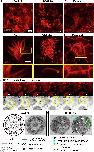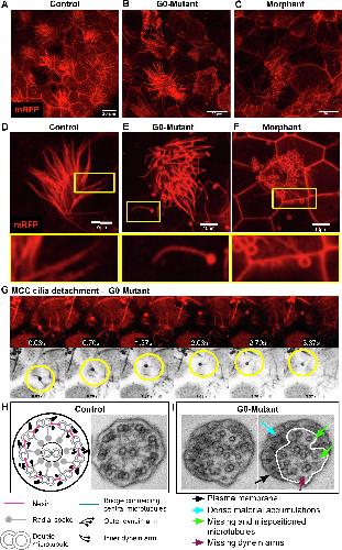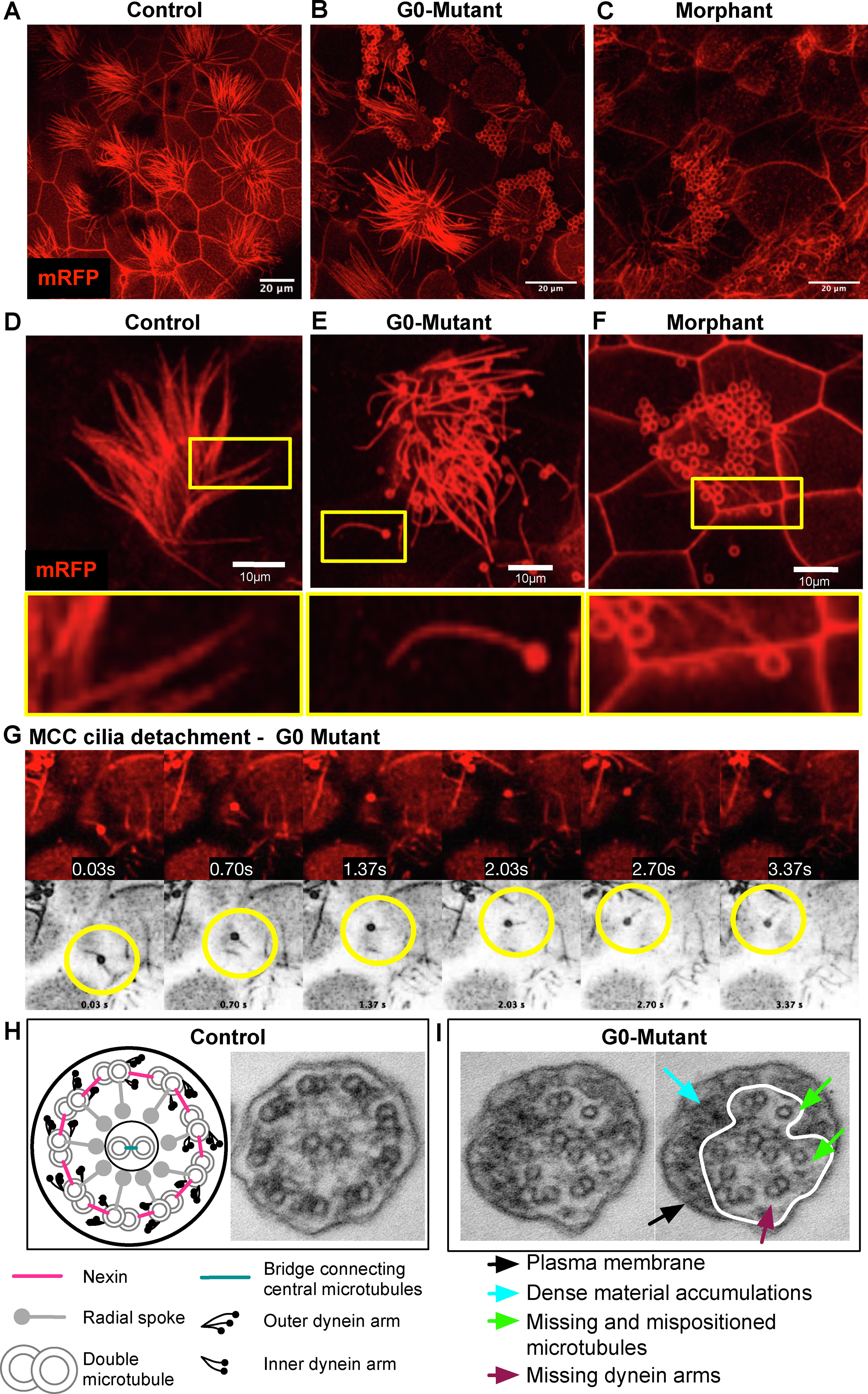 Fig. 4. Epidermal MCCs demonstrate axonemal disorganization and instability when cfap45 is knocked down (AC) Wide-field images of the Epidermal MCCs marked with membrane RFP in controls (A), G0 mutants (B), and morphants (C). When cfap45 is depleted, most MCCs display curled and shortened cilia (Multimedia component 2, Multimedia component 3). (D-F) Focused and magnified MCC images in control (D), G0 mutants (E), and morphants (F) show curling of the cilia leading to shortening and suggesting that the deformation leads to detached cilia. (G) Montaged images from live G0 mutant epidermal cilia imaging show the detached, free-floating cilium. The bottom row is colored black and white to track better the detached cilium encircled in yellow. (H) Electron Microscope image of the transverse section of the epidermal MCC shows 9 + 2 microtubule organization. A pair of microtubules is surrounded by nine pairs connected with radial spokes. This organization is abnormal when cfap45 is depleted using CRISPR. |
