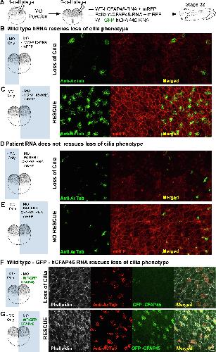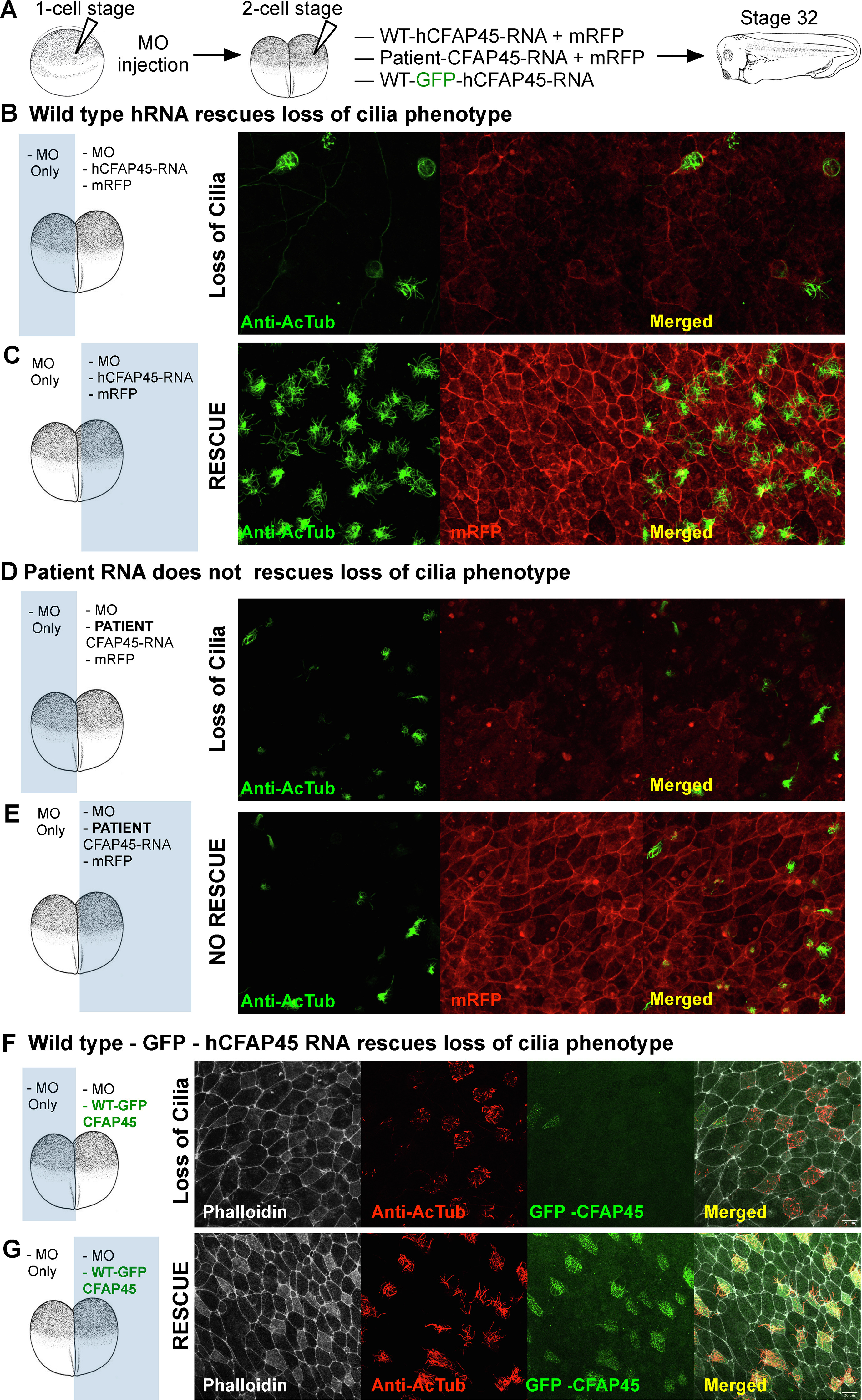 Fig. 5. Wild-type human cfap45 mRNA rescues loss of cilia phenotype, whereas the patient variant fails (A) Experimental setup. First, morpholino is injected at the one-cell stage, followed by human RNA (WT or patient variant) with membrane RFP tracer injection at the two-cell stage. Then, we raised tadpoles to stage 32 to assess epidermal MCCs. (B, D, F) Depletion of Cfap45 by MO results in MCC loss. (C) Wild-type RNA injection at the two-cell stage traced with membrane RFP shows the recovery of the MCCs on the injected side. (E) RNA with patient variation injections traced with membrane RFP fails to recover loss of cilia in MCCs. (G) Wild-type GFP-hCFAP45 RNA injection at the two-cell stage shows the recovery of the MCCs on the injected side. Phalloidin was used to label actin to show cell borders, and an anti-acetylated -tubulin antibody was used to label cilia. |