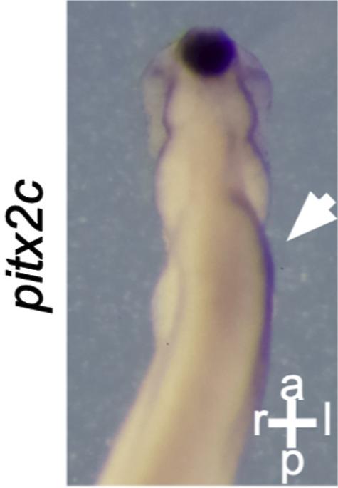 pitx2 (paired like homeodomain 2) gene expression in Xtropicaluis embryo, NF stage 28, assayed via in situ hybridization, lateral view, showing the asymmetrical expression in lateral plate mesoderm on left and right sides of the embryo. |