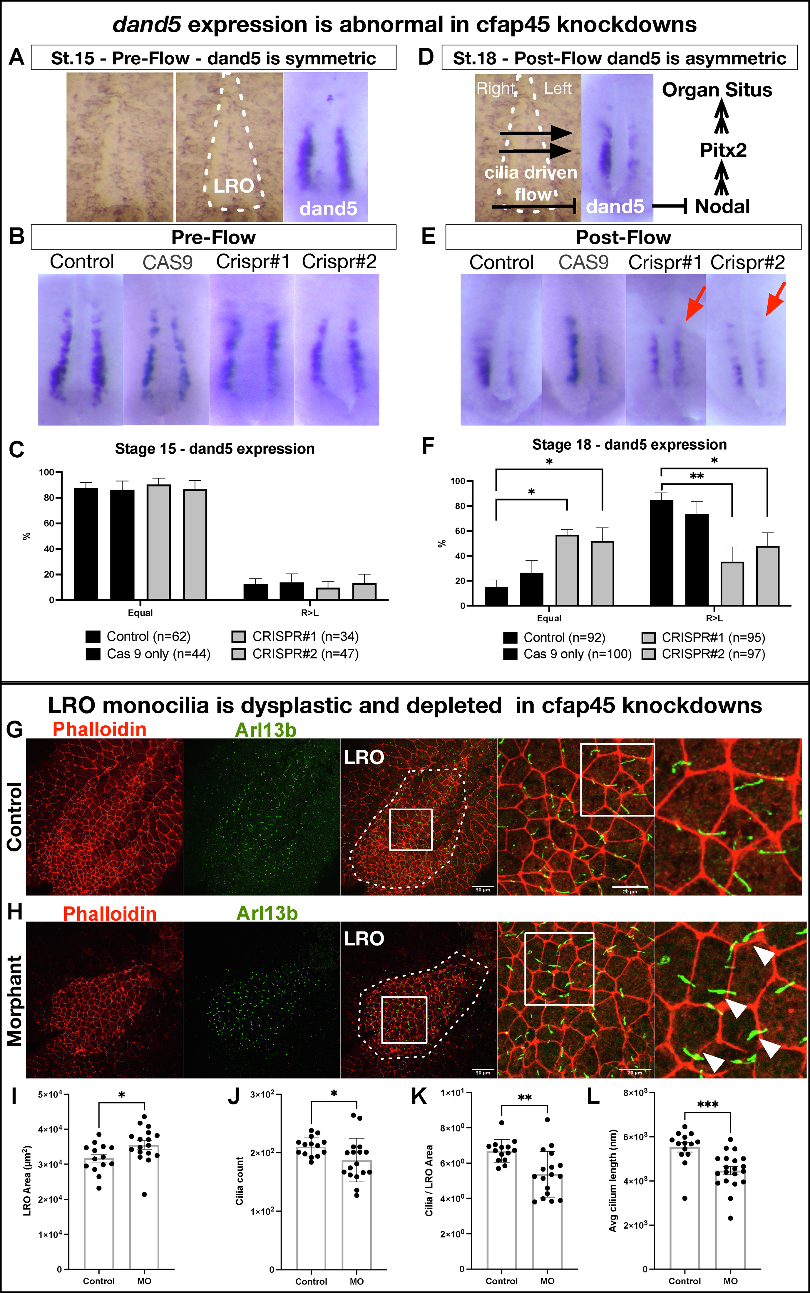 Fig. 2. cfap45 knockdown causes abnormal dand5 expression and defects in LRO cilia (A) dand5 is expressed bilaterally symmetrical in the LRO at stage 15 (pre-flow). (B) Pre-flow, normal bilateral expression of dand5 was observed in G0 mutants compared to uninjected or only CAS9 injected controls. (C) Percentages of normal (equal) and abnormal (R > L) dand5 expression in stage 15 (pre-flow) LROs. G0 mutants show no difference compared to uninjected and Cas9 injected controls. n = number of embryos. (D) At stage 18, right to left cilia-driven fluid flow has emerged, suppressing dand5 expression on the left side of the LRO. (E) Post-flow, normal reduced left side expression in uninjected and Cas9 injected controls show up as abnormal bilateral expression in G0 mutants indicated with red arrows. (F) Percentages of normal (R > L) and abnormal (equal) dand5 expression in stage 18 (post-flow) LROs. A significant number of G0 mutants show abnormal bilateral dand5 expression compared to uninjected and Cas9 injected controls—n = number of embryos. (G–H) LROs stained with phalloidin to label cell borders and anti - Arl13b antibody to label monocilia. The white dashed line indicates the LRO area. LRO monocilia were malformed and lost in morphants, also showing bulging at the tip and midshaft of the cilia, indicated by white arrows. White squares indicate the magnified areas (H). LRO area is slightly enlarged (I), and cilia numbers (J), cilia per LRO area (K), and cilia length are reduced in morphants. MO: Morpholino oligo, LRO: Left-right organizer.∗p < 0.05, ∗∗p < 0.01. |