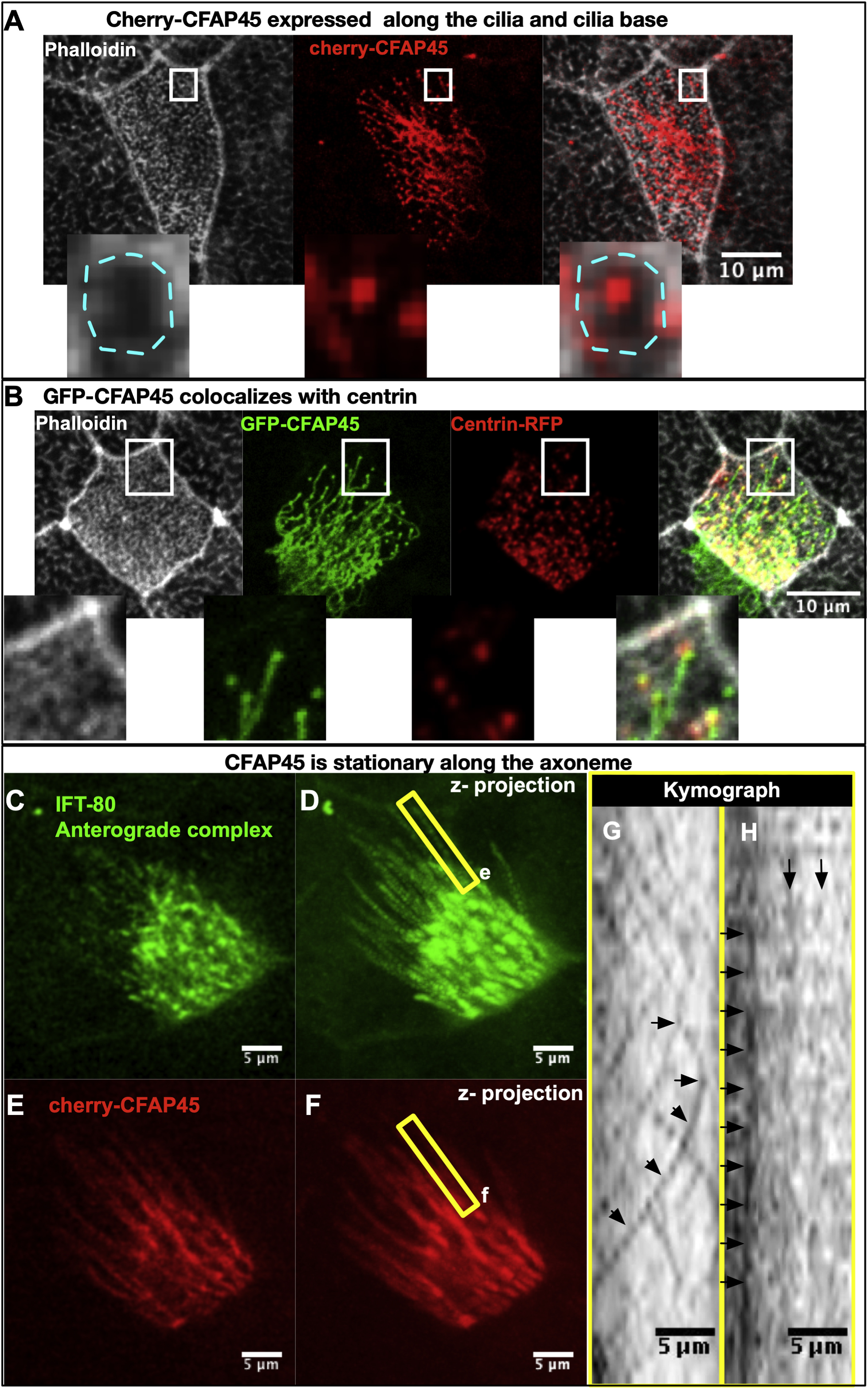 Fig. 7. CFAP45 localized to the base of the cilia and the ciliary axoneme and, unlike IFT80 protein, is stationary within the cilia. (A) Cherry - CFAP45 expressed in the epidermal MCCs. Actin in MCCs stained with phalloidin (grey) delineates the cell borders and the apical actin network where the base of the cilia is located at the center. The magnified view delineates the circular actin network (blue). CFAP45 is enriched at the base of the cilia and situated in the center of the apical network. (B) GFP- CFAP45 expressed in MCCs and colocalized with Centrin at the base of the cilia. (C) IFT-80-GFP expressed in MCC. (D) z-projection of fifty frames. (E) CFAP45-Cherry expressed in MCC. (F) z-projection of fifty frames. (G) Kymograph presents the movement of the IFT80-GFP proteins along the single cilium. Multiple lines represent multiple IFTs. As the protein travels, intensity displaces along the cilium forming tracks over time. One particle tracked over time was marked with black arrows. (H) Kymograph presents stationary CFAP45-cherry protein. As no movement is observed, multiple straight lines form over time, representing the non-uniform punctuated pattern of cfap45. (Yellow rectangle encloses the single cilium analyzed.) |