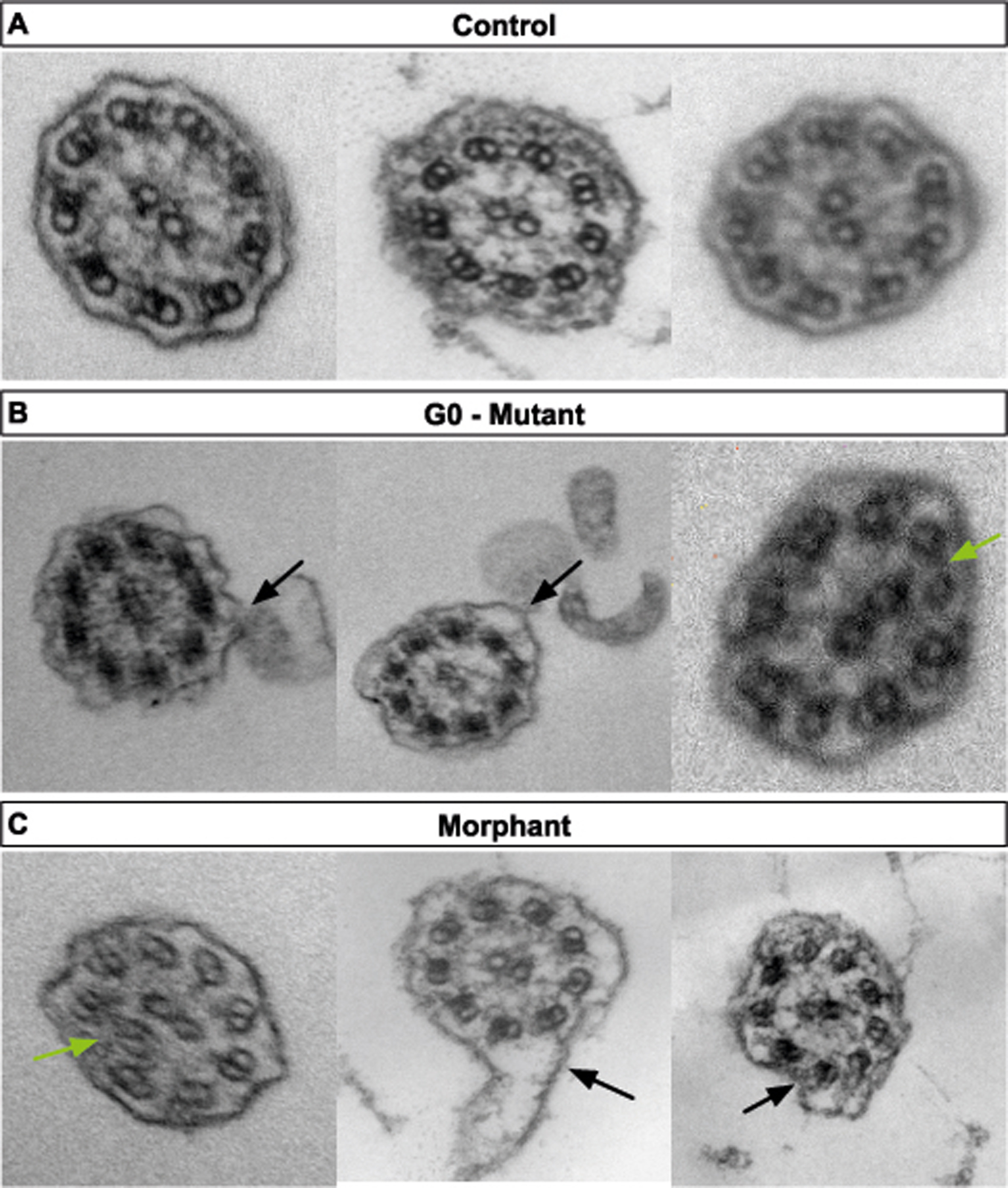 Supplemental Fig. 2. (A)TEM images of transverse sections of multiciliated cell cilia showing normal 9 + 2 microtubule organization in controls. A pair of microtubules is surrounded by nine pairs connected with radial spokes. (BC) TEM images showing abnormal plasma membranes indicated by black arrows and/or abnormal microtubule structure and organization indicated by green arrows in G0 mutants (B) and morphants (C). |