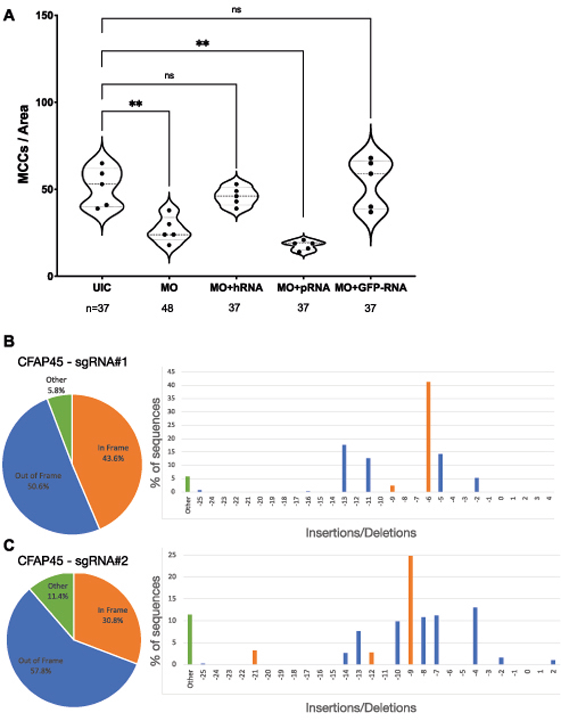 Supplemental Fig. 3. (A) Quantification of the number of MCC per area in tadpoles injected with MO, MO, and hRNA, MO and patient variant RNA, and MO and GFP tagged human RNA. Each point represents a biological replicate of multiple individual embryos. p < 0.01. (B) Using ICE Synthego, we verified that CRISPR/Cas9 edited the proper cut site. Genotyping results to confirm the knockdown of the cfap45 gene. (8419 Ice Score for sgRNA #1 (target exon 2) and a 72 24 knockout score for sgRNA#2 (target exon 3)). |