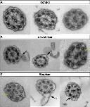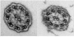 TEM images of transverse sections of multiciliated cell cilia showing normal 9 + 2 microtubule organization |