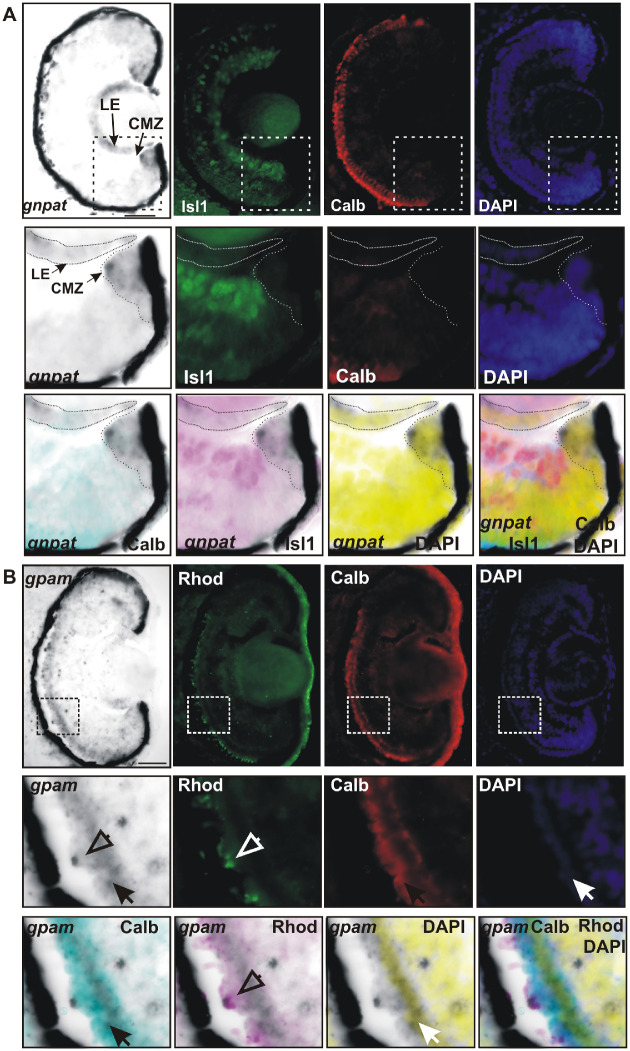 PURPOSE: Plasmalogens (Plgs) are highly abundant lipids in the retina, and their deficiency leads to severe abnormalities during eye development. The first acylation step in the synthesis of Plgs is catalyzed by the enzyme glyceronephosphate O-acyltransferase (GNPAT), which is also known as dihydroxyacetone phosphate-acyltransferase (EC 2.3.1.42). GNPAT deficiency produces rhizomelic chondrodysplasia punctata type 2, a genetic disorder associated with developmental ocular defects. Despite the relevance of retinal Plgs, our knowledge of the mechanisms that regulate their synthesis, and the role of GNPAT during eye development is limited. METHODS: Using the Xenopus laevis model organism, we characterized by in situ hybridization the expression pattern of gnpat and compared it to glycerol 3-phosphate acyltransferase mitochondrial (gpam or gpat1) during eye neurogenesis, lamination, and morphogenesis. The Xenopus Gnpat was biochemically characterized in a heterologous expression system in yeast. RESULTS: During development, gnpat is expressed in proliferative cells of the retina and lens, and post-embryogenesis in proliferative cells of the ciliary marginal zone and lens epithelium. In contrast, gpam expression is mainly restricted to photoreceptors. Xenopus Gnpat expressed in yeast is present in both soluble and membrane fractions, but only the membrane-bound enzyme displays activity. The amino terminal of Gnpat, conserved in humans, shows lipid binding capacity that is enhanced by phosphatidic acid. CONCLUSIONS: Enzymes involved in the Plgs and glycerophospholipid biosynthetic pathways are differentially expressed during eye morphogenesis. The gnpat expression pattern and the molecular determinants regulating Gnpat activity advance our knowledge of this enzyme, contributing to our understanding of the retinal pathophysiology associated with GNPAT deficiency.