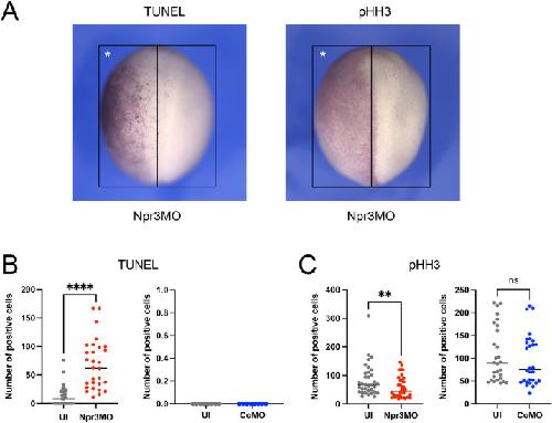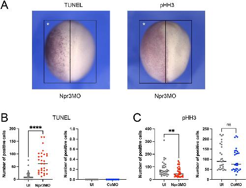 Figure 2—figure supplement 2. Npr3-depletion affects the rate of cell death or proliferation in the dorsal ectoderm.(A) Whole-mount TUNEL (left panel) and pHH3 (right panel) staining of stage 15 embryos injected with Npr3MO on the left side (asterisk). Dorsal views, anterior to top. The black boxes outline the area of the dorsal ectoderm in which TUNEL- and pHH3-positive cells were quantified for each half of the embryo. (B–C) Quantification of the number of TUNEL-positive (B) and pHH3-positive (C) cells in the dorsal ectoderm of CoMO- or Npr3MO-injected embryos comparing injected vs. uninjected sides (UI). Combined data from three biological replicates are shown. Each dot represents one embryo. p- values were calculated using paired t-test, ** p<0.0095, **** p<0.0001; ns: not significant. Note: We observed variability in the number of TUNEL-positive cells at the uninjected side. In their original report describing the dynamic of programmed cell death during Xenopus development, Hensey and Gautier, 1998 also reported considerable variation in the degree of TUNEL staining and patterns between embryos, including left-right asymmetries. The authors speculated that the presence of a fraction of TUNEL-negative embryos during gastrulation and neurulation might reflect the rapid clearance of dead cells from the embryo. |