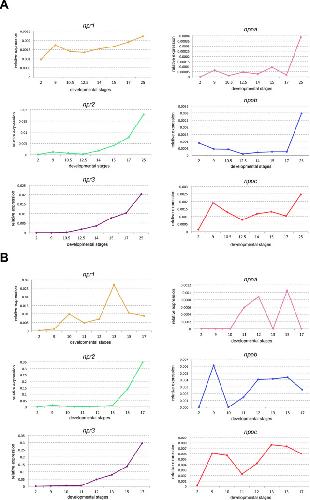 Figure 1—figure supplement 1 Developmental RT-PCR of natriuretic peptide signaling pathway components. Developmental qRT-PCR expression profile of npr1, npr2, npr3, nppa, nppb and nppc in two biological replicates (A and B) of WT Xenopus embryos. NF stages are indicated on x-axis, values are normalized to odc. |