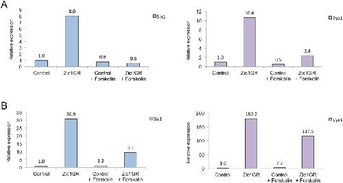 Figure 4—figure supplement 1. Forskolin treatment interferes with six1 and eya1 induction by Zic1GR.qRT-PCR analysis of six1 and eya1 expression in Zic1GR-injected animal caps untreated or treated with 50 μM Forskolin, from two biological replicates (A and B). Expression levels are normalized to odc. |