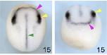 nppc (natriuretic peptide C) gene expression in X. laevis embryo, NF stage 16, assayed via in situ hybridization, anterior view, dorsal up. Key: neural plate border (black arrowheads) |