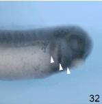 npr1 (natriuretic peptide receptor 1) gene expression in X. laevis embryo, NF stage 32, assayed via in situ hybridization, lateral view, anterior right dorsal up. Key: white arrowheads indicate expression in pharyngeal arches. |