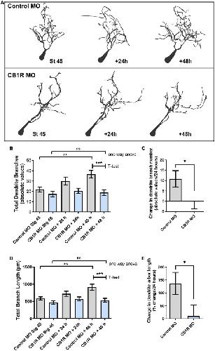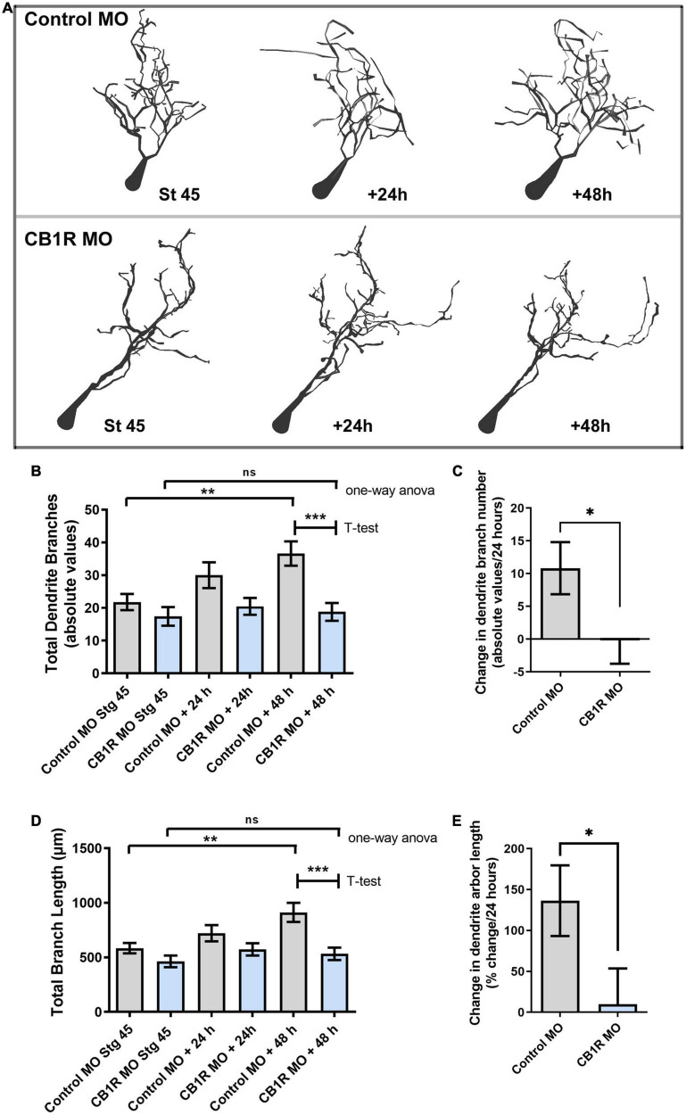 FIGURE 7. Single-cell CB1R knockdown decreases the branching and growth of tectal neurons in vivo. (A) Tracings of sample neurons in stage 45 tadpoles transfected with Alexa 488 dextran and lissamine-tagged Control MO or CB1R MO and imaged in vivo by two-photon confocal microscopy over the course of 3 days. Dendritic arbors were digitally reconstructed in three-dimensions using the Neuromantic tracing software and rendered for illustration purposes using Adobe Photoshop. (B) Dendritic arbors of neurons with CB1R MO had a similar number of branches as Control MO neurons at stage 45 after but possessed a significantly a lower number of branches than controls by the 48-h imaging time point. (C) Quantifying the rate of branch addition as the change in branch number in every 24 h-imaging intervals showed that neurons transfected with Control MO increased their complexity by adding new branches, neurons transfected CB1R MO failed to increase the complexity of their dendritic arbor. (D,E) Quantification of total dendritic arbor length reveals that tectal neurons with CB1R MO fail to increase their dendritic arbor length (D) and grow at a lower rate (E) than Control MO transfected neurons (n = 29 neurons per condition). Statistical analysis by one-way ANOVA and Student’s t-test. Mean ± SEM. *p ≤ 0.05, **p ≤ 0.005, ***p ≤ 0.001.
