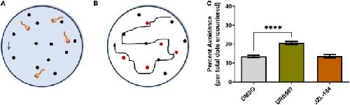 FIGURE 8. URB597 treatment enhances visually guided responses. (A) Schematic of the visual avoidance task. Tadpoles at stage 45, treated with vehicle (0.1% DMSO in rearing solution), URB597 or JZL184, were tested for their ability to alter their swimming behavior upon encountering moving dots (arrow depicts downward movement of dots). (B) The tadpole’s swimming path and responses to advancing stimuli (black and red circles) were tracked and analyzed. A tadpole freezing response upon coinciding with the stimulus (red circles) or changing its swimming direction and speed was considered active avoidance. (C) Tadpoles treated with URB597 had increased avoidance responses to the presentation of the stimulus 24 h post-treatment when compared to vehicle treated controls. Control n = 24 tadpoles, URB597 n = 20 tadpoles, JZL184 n = 20 tadpoles. Mean ± SEM. ****p ≤ 0.0001.