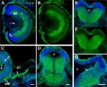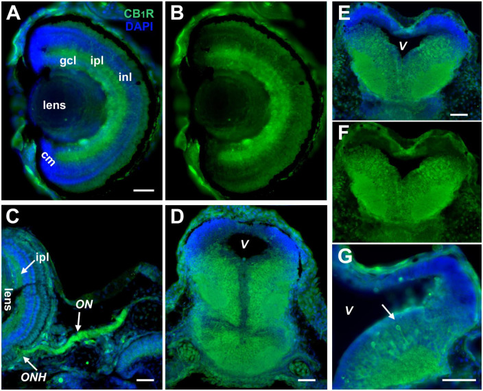 FIGURE 1. CB1R expression in the developing Xenopus visual system. (A,B) Coronal section of a retina of a stage 45 tadpole shows localization of strongest CB1R immunoreactivity (green) in the ganglion cell layer (gcl), inner nuclear layer (inl), and the inner plexiform layer (ipl). The cellular layers are clearly denoted by the DAPI staining in (A) (blue). Note the absence of CB1R immunoreactivity in the ciliary margin (cm). (C) Strong CB1R immunoreactivity is also observed in the optic nerve head (ONH) where RGC axons exit the retina, and along the optic nerve (ON). (D–F) CB1R expression in the brain is illustrated by the coronal sections of midbrain (D), caudal midbrain (E,F) and rostral hindbrain (G) where CB1R immunoreactivity (green) localizes to cell bodies that lay medially and in the adjacent neuropil of stage 43 to stage 45 tadpoles. Note the individual neuronal cell bodies and processes projecting to the neuropil with strong CB1R immunoreactivity (G, arrow). In (D,E,G), the DAPI staining highlights the lower CB1R immunoreactivity in the proliferative zones near the ventricle (V) and its absence in the dorsal-most portion of the brain. Scale bars = 50 μm. Similar patterns of CB1R immunoreactivity were obtained with two commercial antibodies to CB1R (A,B,E–G; Cayman Chemicals, and C,D; Calbiochem).