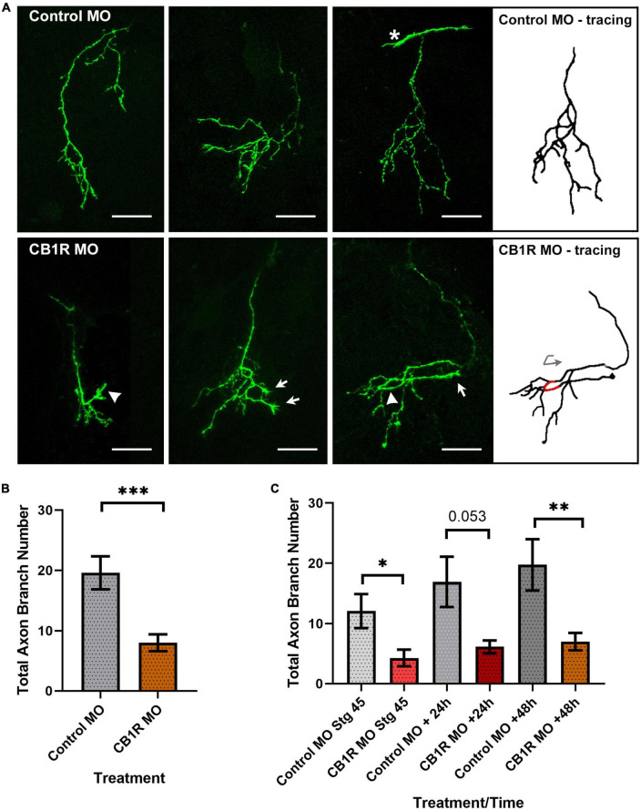 FIGURE 2. CB1R downregulation alters RGC axon morphology. (A) Projections of three individual RGC axons transfected with Control MO (top) or CB1R MO (bottom) imaged in vivo by two-photon confocal microscopy. While axons from RGCs transfected with the CB1R MO targeted normally within the tectal neuropil, their branching patterns and morphologies differed from those of RGCs in tadpoles transfected with Control MO. Qualitatively, axons from RGCs with CB1R knockdown had more branches that terminated in growth cones (arrows) and/or took abnormal turns (arrowheads). The tracing for the third CB1R MO sample axon better illustrates the abnormal turn (red; curved arrow) taken by the axon. The asterisk in the third Control MO sample points to the growth cone of a targeting RGC axon. Scale bars = 50 μm. (B) Quantitatively, axons from RGCs with CB1R knockdown had significantly fewer branches when compared to axons from RGCs transfected with Control MO 48 h after transfection (n = 23 axons per condition, one axon per tadpole). (C) When imaging over the course of 3 days, axon branch number was significantly lower in RGCs with CB1R MO knockdown at the initial imaging (stage 45), with a trend at the 24-h imaging interval (+24 h) and remaining significantly lower when compared to controls at the end of the imaging period (+48 h). Control MO n = 12; CB1R MO n = 11. Mean ± SEM. *p ≤ 0.05, **p ≤ 0.005, ***p ≤ 0.001.