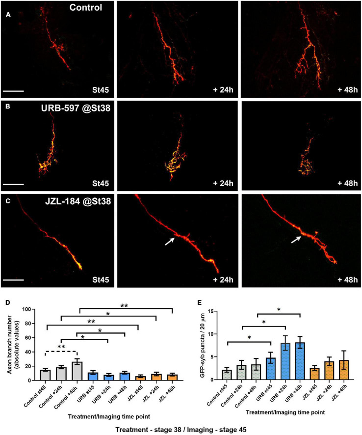 FIGURE 5. URB597 or JZL184 treatment during early axon pathfinding and targeting results in RGC axons with much simpler morphologies as they branch at their target. Tadpoles were treated with URB597 or JZL184 beginning at stage 38 until stage 45, when tadpoles with RGC axons expressing tdTomato and GFP-synaptobrevin were imaged for three consecutive days in the absence of the drug. (A–C) Sample RGC axons in tadpoles treated with vehicle solution (A; Control), URB597 (B) or JZL184 (C) imaged in vivo by confocal microscopy at stage 45, and 24, and 48 h after first imaging. Arrow in (C) points to the first branching point of the axon. Scale bars = 50 μm. (D) Quantitative analysis of branch number in RGC axons of tadpoles exposed to the drugs from stage 38 to stage 45 showed that RGC axons in both JZL184 and URB597-treated tadpoles failed to increase their branch number over the course of 48 h when compared to controls (n = 11 axons per condition). Axons in control-treated tadpoles significantly increased their branch number over the 48-h imaging period. (E) The density of GFP-synaptobrevin puncta per arbor was calculated as the number of puncta per 20 μm. When compared to controls, axons in URB597-treated tadpoles had a significant higher puncta density at all imaging intervals. Analysis by ANOVA with Sidak’s multiple comparisons tests. Mean ± SEM, *p ≤ 0.05, **p ≤ 0.005.