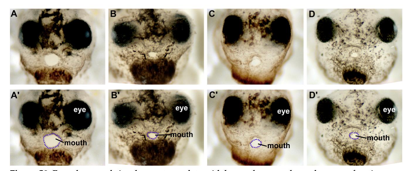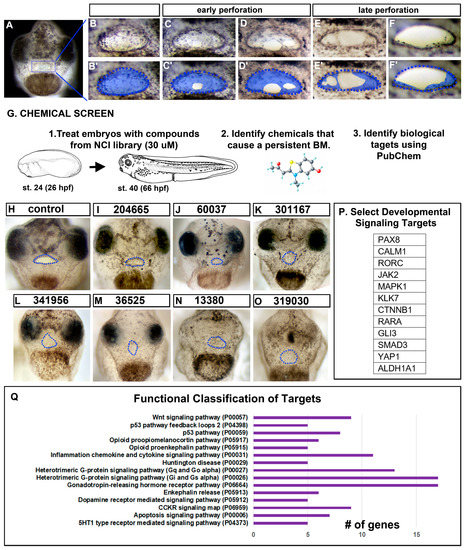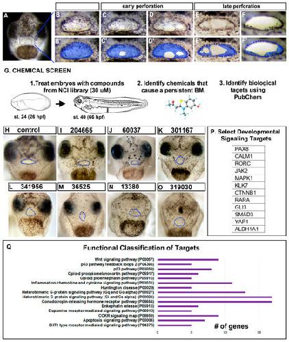 Figure 1. Buccopharyngeal membrane rupture and chemical screen. (A) Frontal view of the face of an embryo at stage 39 prior to the perforation of the buccopharyngeal membrane. (B–F’) magnified images of the mouth at progressive points of buccopharyngeal membrane perforation. In the prime labeled images, the buccopharyngeal membrane is shaded blue. Each image is from a different embryo that represents the most common appearance at each stage (from over 200 embryos examined in 10 biological replicates). (G) Schematic outlining the chemical screen. (H–O) A subset of representative embryos treated with select chemicals causing a persistent buccopharyngeal membrane but with a stomodeum present. The presumptive mouth is outlined in blue dots. The National Service Center Number identifier is shown above each embryo. (P) Protein symbols of select targets of chemicals causing a persistent buccopharyngeal membrane. (Q) The top functional categories identified from the targets of chemicals causing a persistent buccopharyngeal membrane. The GO identifier is in brackets. Abbreviations: # = number, st. = stage.