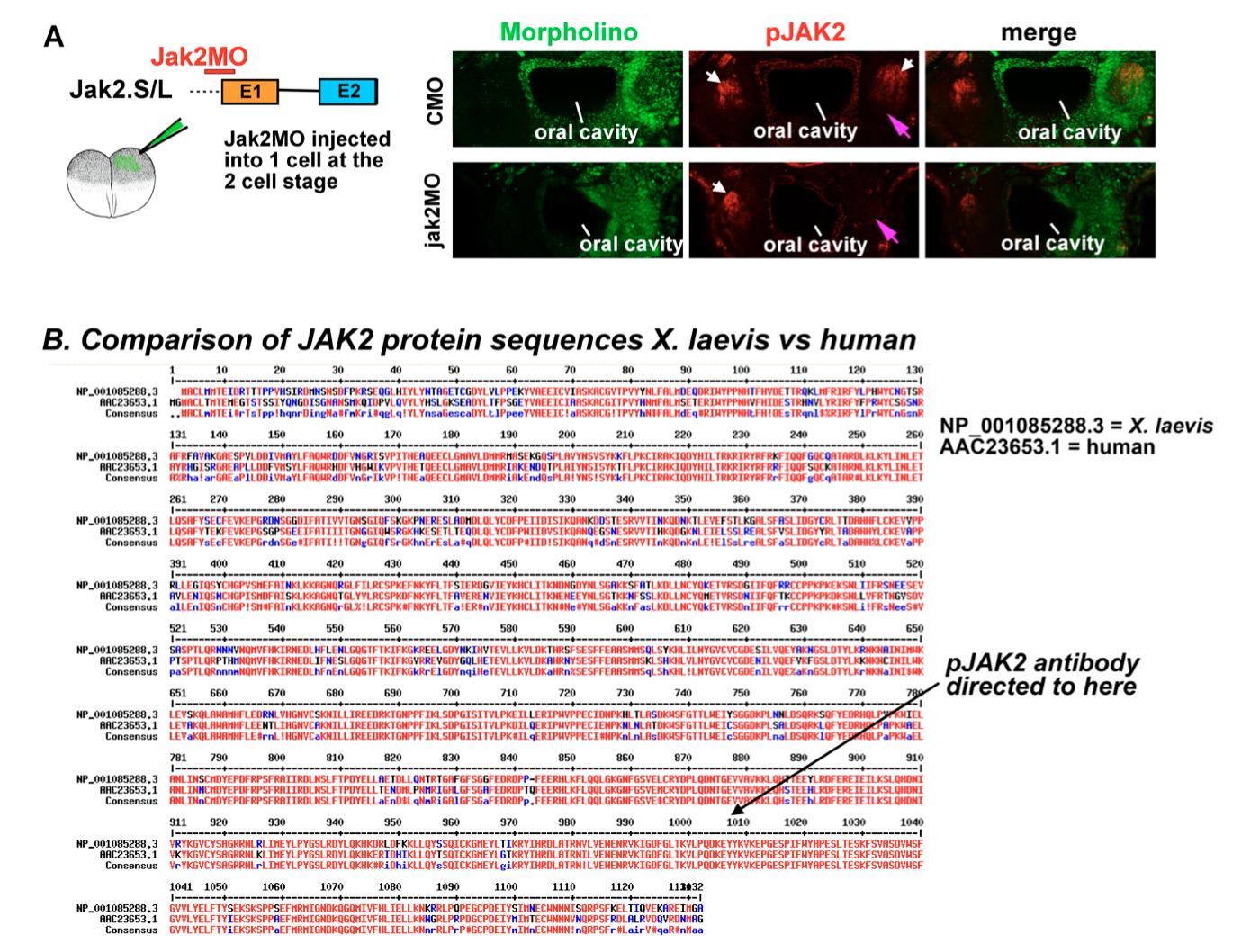 Figure S1. Jak2 protein sequence and validation of the morpholino.